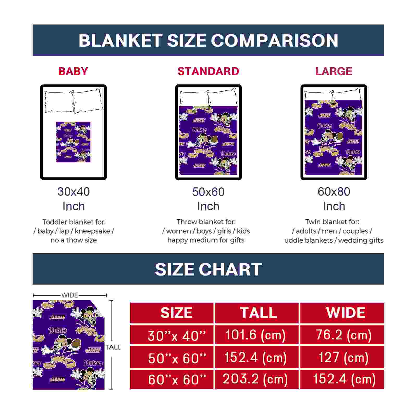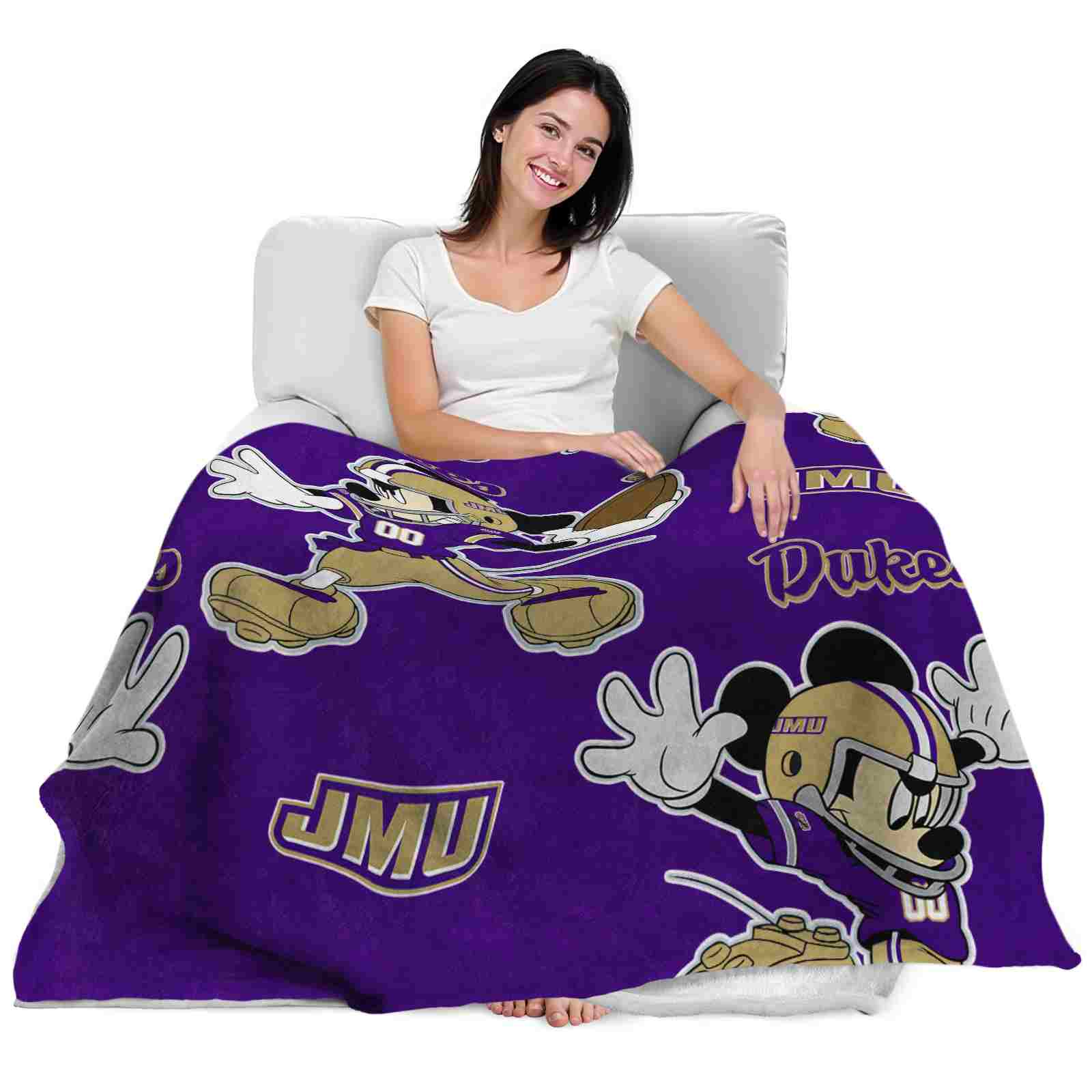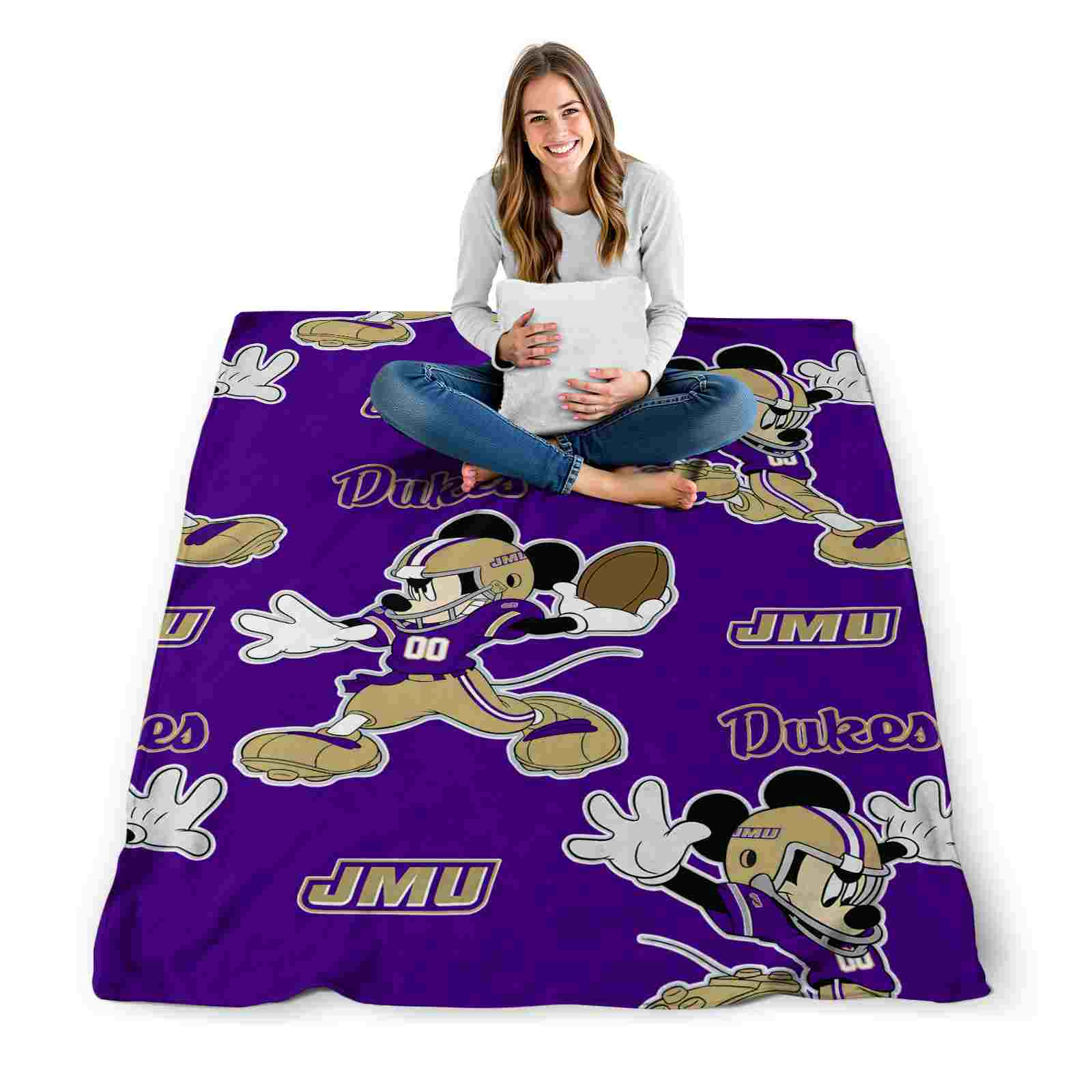 Without a doubt, the Customized James Madison Dukes Mickey Purple Blanket from James Madison Dukes Blankets collection is offering true fans a chance to showcase passion in a cool way. Personalize it with your favorite team's logo or a meaningful name to make it uniquely yours. Isn't that great? The full-color print ensures vibrant, edge-to-edge designs, bringing your sports enthusiasm to life!