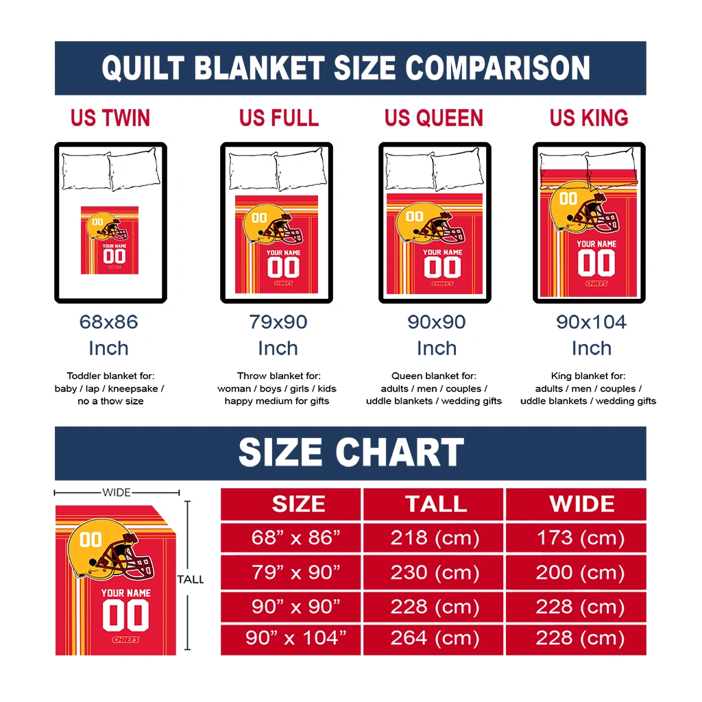 Wrap yourself in warmth and pride with the Customized Kansas City Chiefs Helmet Theme Red Quilt Blanket from the Kansas City Chiefs Blankets collection at Yes That Blanket. Made from 100% premium quilting-weight polyester blended with a touch of microfiber, this quilt offers a smooth, soft finish you’ll love. Choose between two quilting styles—Stipple or Diagonal—and enjoy the comfort of a cotton-filled layer inside that adds extra coziness for every season. The border is available in classic black or white, giving your design a clean, timeless edge.