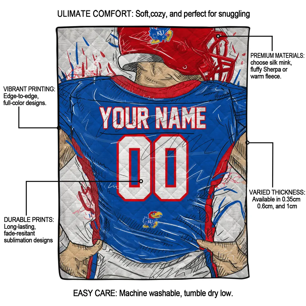 The Customized Kansas Jayhawks Player Sketch Blue Gray Quilt Blanket is more than a blanket—it’s everyday comfort, thoughtfully made. Crafted from premium quilting fabric with a soft microfiber touch, it offers a smooth hand-feel and lasting coziness. Layered quilting with a cotton-filled core provides adaptable warmth across seasons while maintaining a clean, tailored look on your bed or sofa.