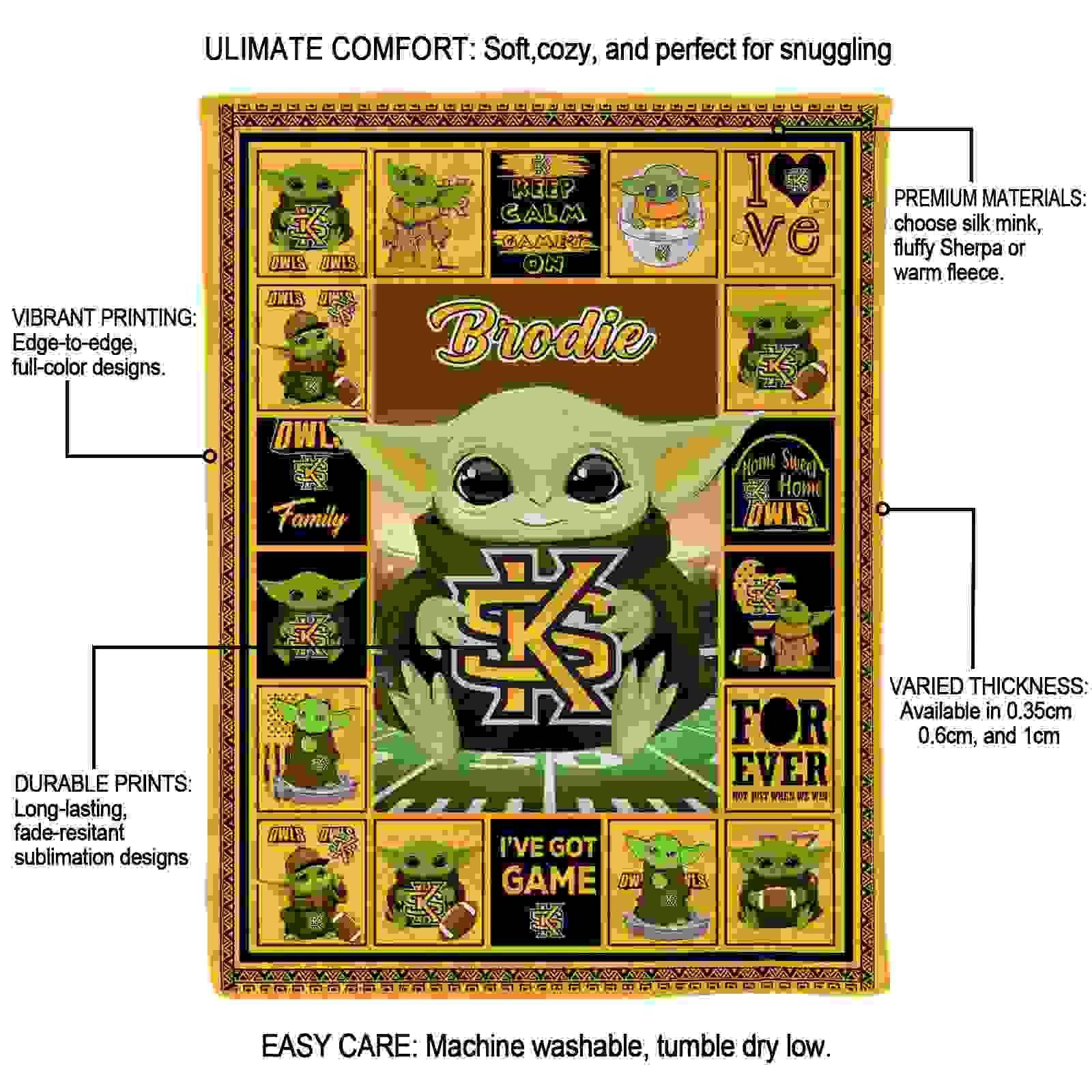 Without a doubt, the Customized Kennesaw State Owls Baby Yoda Gold Blanket from Kennesaw State Owls Blankets collection is offering true fans a chance to showcase passion in a cool way. Personalize it with your favorite team’s logo or a meaningful name to make it uniquely yours. Isn’t that great? The full-color print ensures vibrant, edge-to-edge designs, bringing your sports enthusiasm to life!