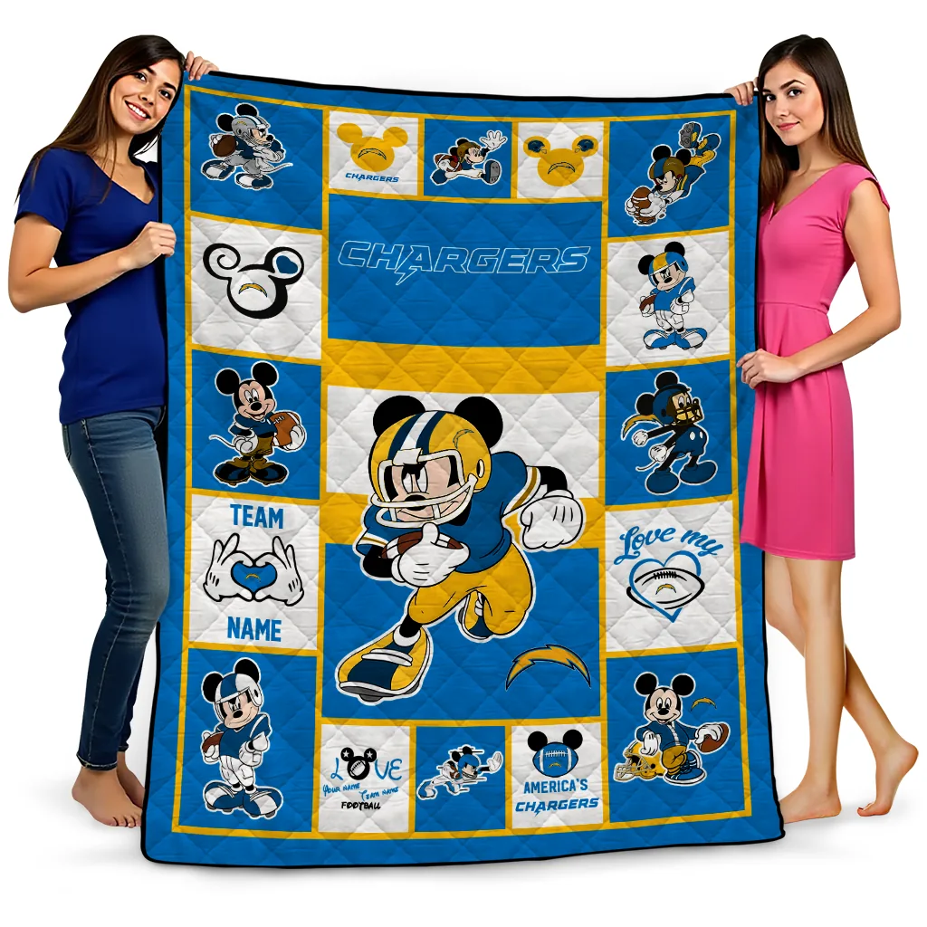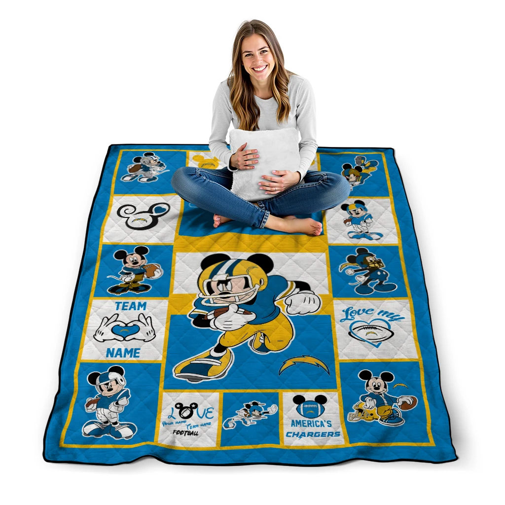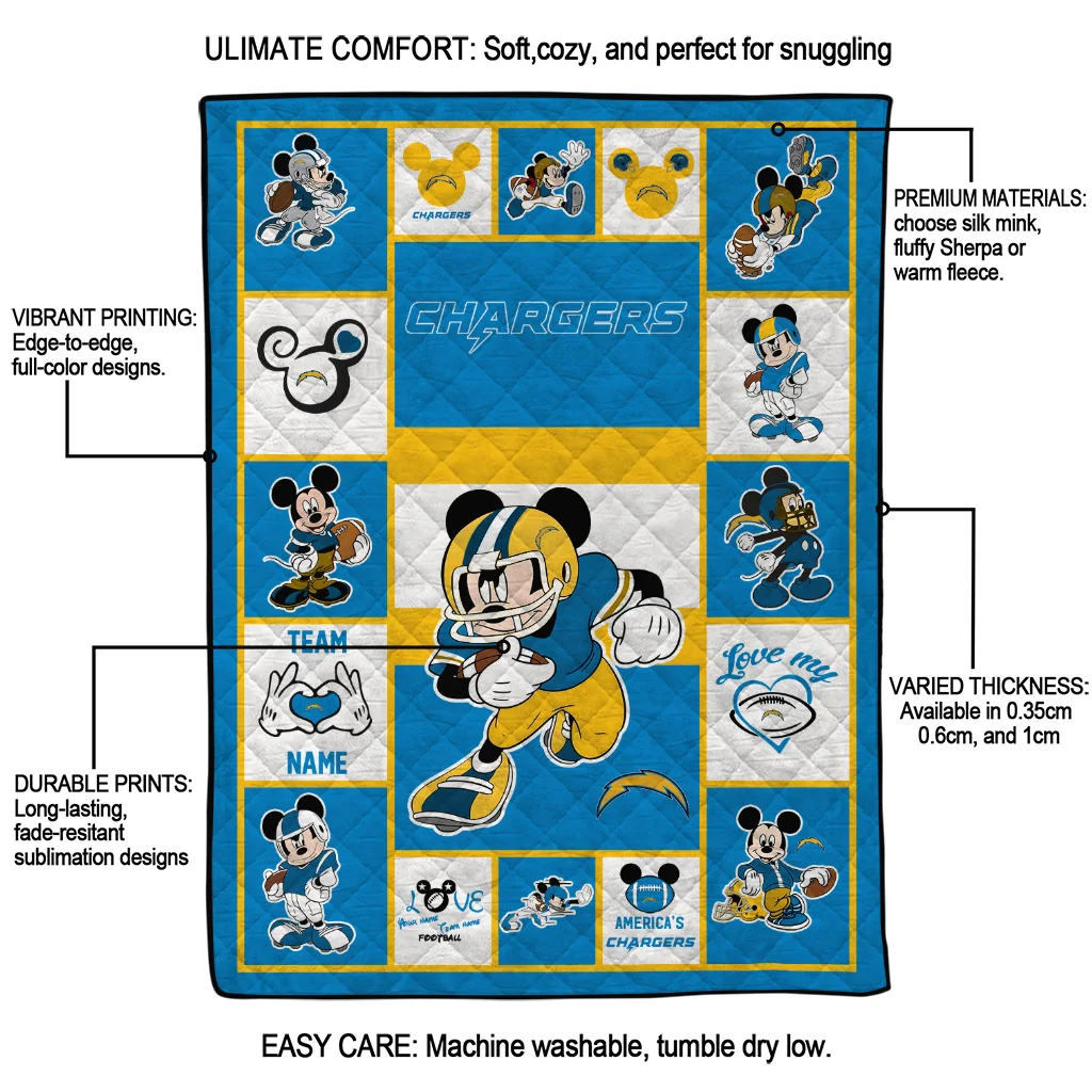 Wrap yourself in warmth and pride with the Customized Los Angeles Chargers Mickey Crimson Blue White Quilt Blanket from the Los Angeles Chargers Blankets collection at Yes That Blanket. Made from 100% premium quilting-weight polyester blended with a touch of microfiber, this quilt offers a smooth, soft finish you’ll love. Choose between two quilting styles—Stipple or Diagonal—and enjoy the comfort of a cotton-filled layer inside that adds extra coziness for every season. The border is available in classic black or white, giving your design a clean, timeless edge.