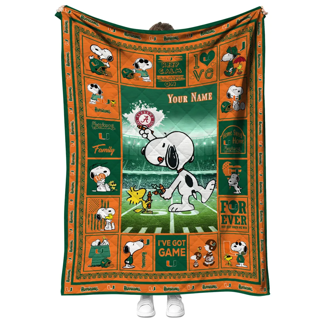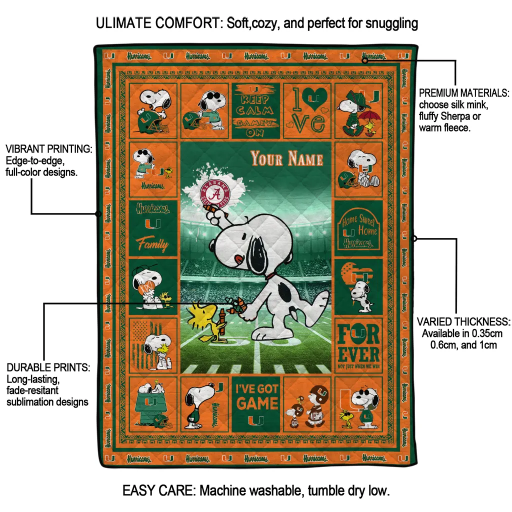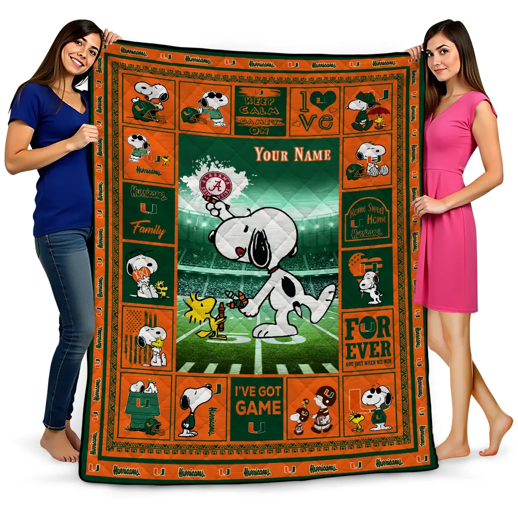 Wrap yourself in warmth and pride with the Customized Miami Hurricanes Snoopy Coach Orange Quilt Blanket from the Miami Hurricanes Blankets collection at Yes That Blanket. Made from 100% premium quilting-weight polyester blended with a touch of microfiber, this quilt offers a smooth, soft finish you’ll love. Choose between two quilting styles—Stipple or Diagonal—and enjoy the comfort of a cotton-filled layer inside that adds extra coziness for every season. The border is available in classic black or white, giving your design a clean, timeless edge.