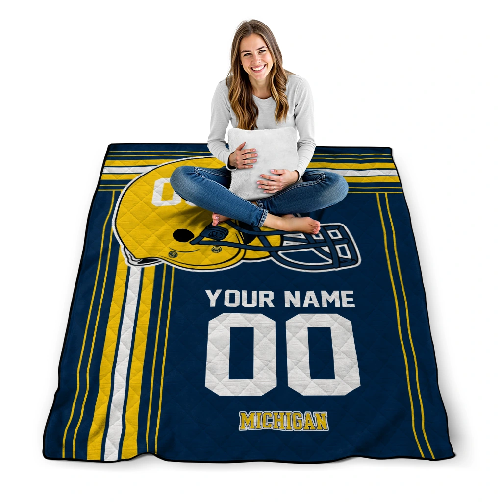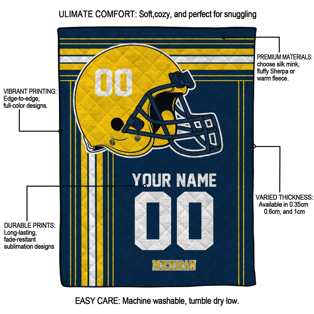 Customized Michigan Wolverines Helmet Theme Blue Quilt Blanket