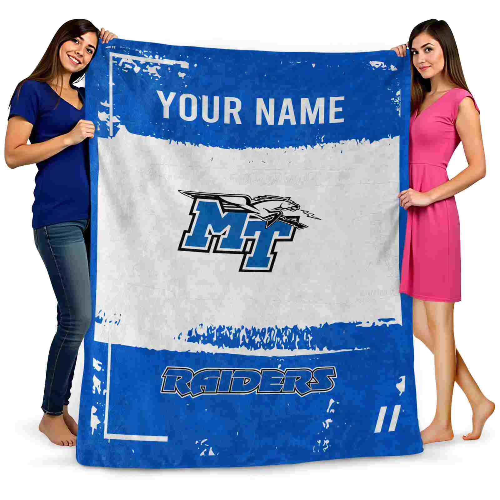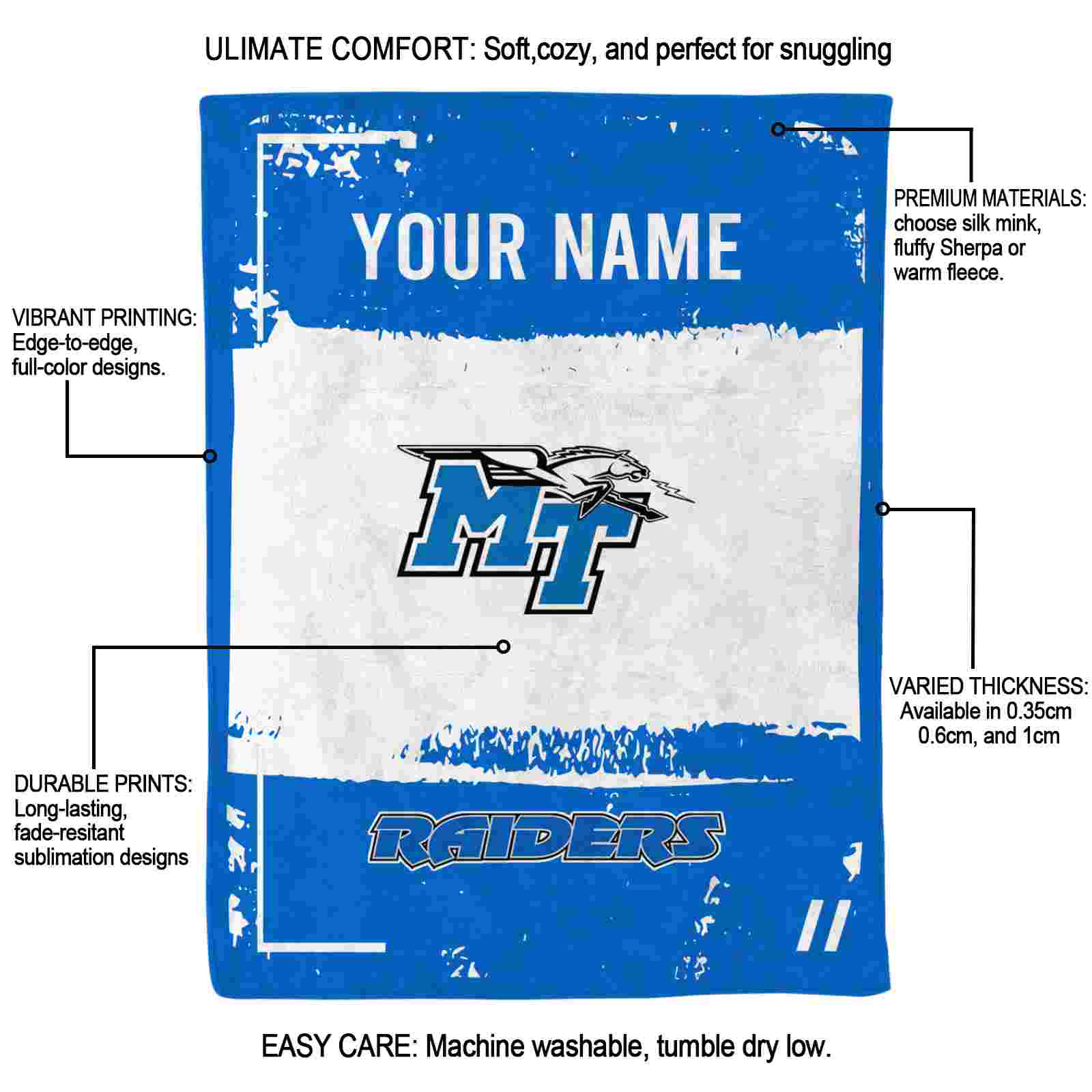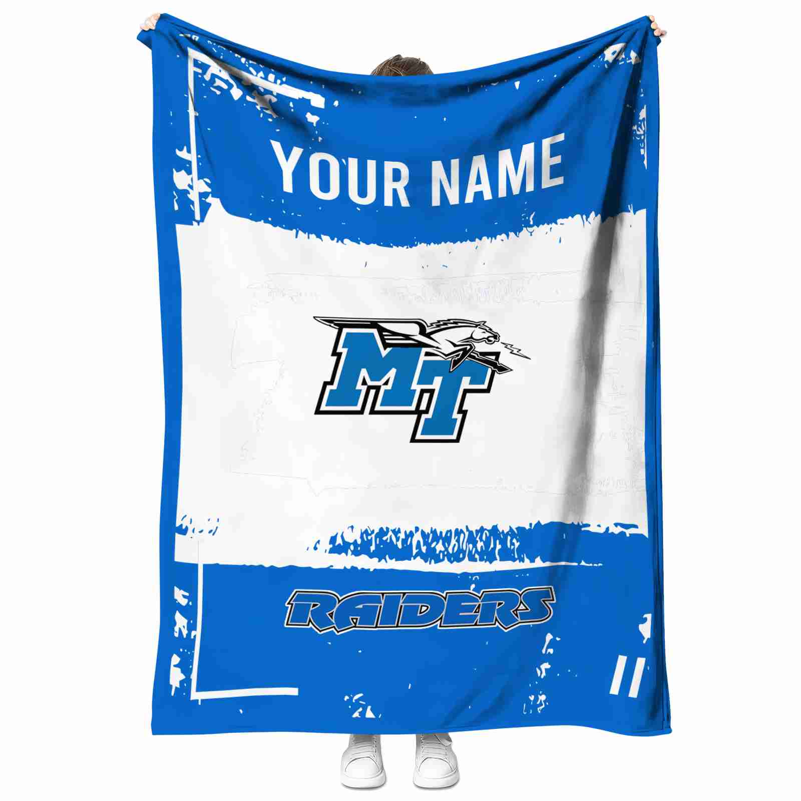 Without a doubt, the Customized Middle Tennessee Blue Raiders Paint Strokes Blue White Blanket from Middle Tennessee Blue Raiders Blankets collection is offering true fans a chance to showcase passion in a cool way. Personalize it with your favorite team's logo or a meaningful name to make it uniquely yours. Isn't that great? The full-color print ensures vibrant, edge-to-edge designs, bringing your sports enthusiasm to life!