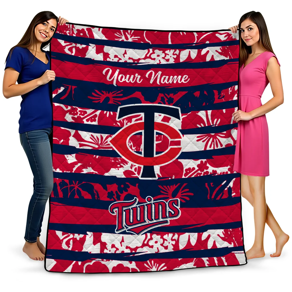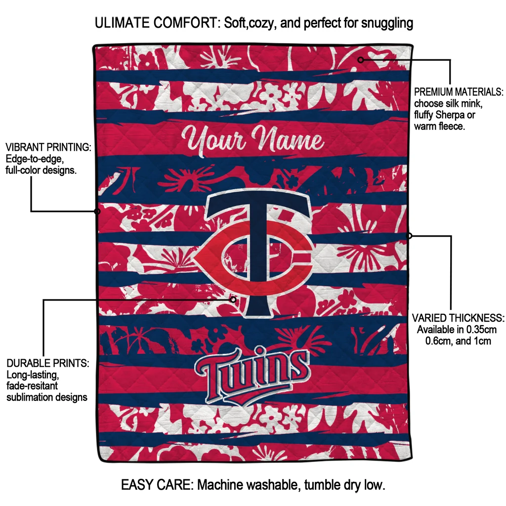 Wrap yourself in warmth and pride with the Customized Minnesota Twins Layered Florals Navy White Quilt Blanket from the Minnesota Twins Blankets collection at Yes That Blanket. Made from 100% premium quilting-weight polyester blended with a touch of microfiber, this quilt offers a smooth, soft finish you’ll love. Choose between two quilting styles—Stipple or Diagonal—and enjoy the comfort of a cotton-filled layer inside that adds extra coziness for every season. The border is available in classic black or white, giving your design a clean, timeless edge.