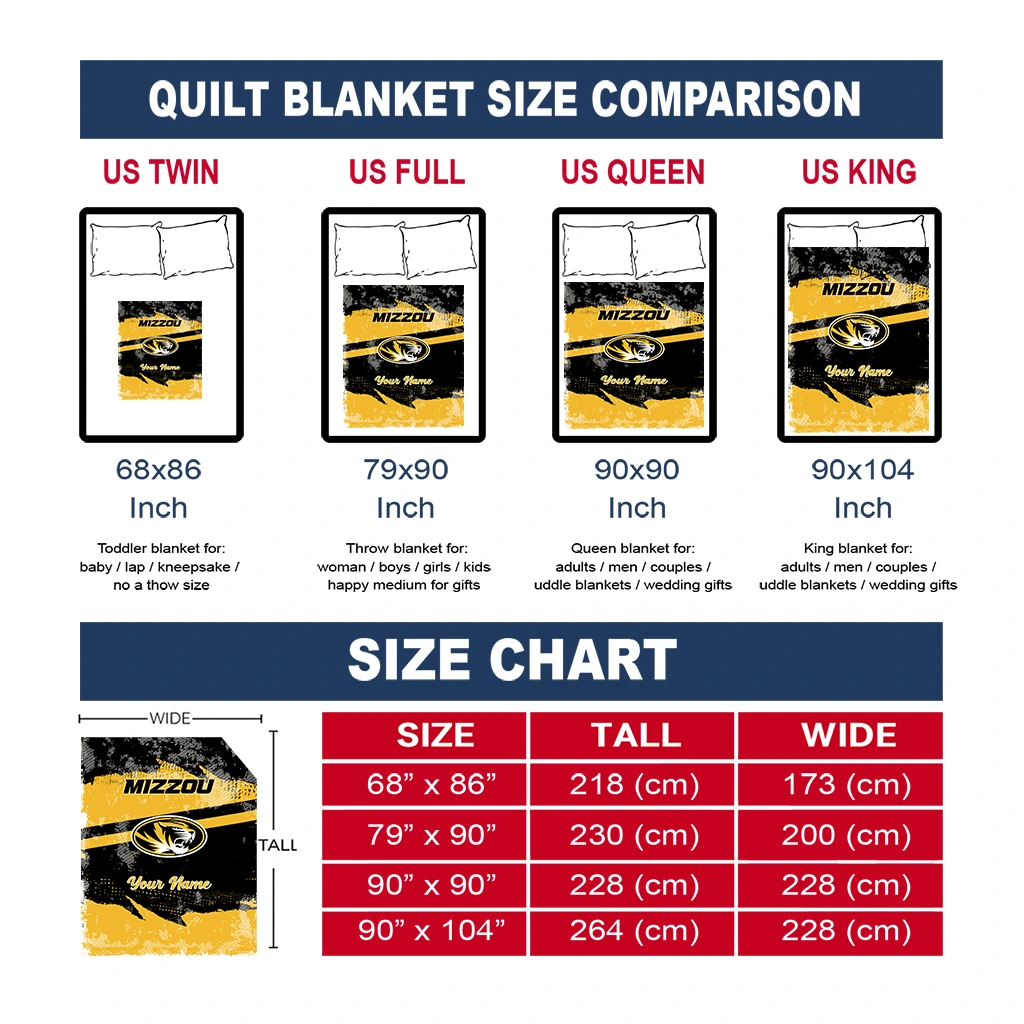 Wrap yourself in warmth and pride with the Customized Missouri Tigers Brushstroke Layers Black Quilt Blanket from the Missouri Tigers Blankets collection at Yes That Blanket. Made from 100% premium quilting-weight polyester blended with a touch of microfiber, this quilt offers a smooth, soft finish you’ll love. Choose between two quilting styles—Stipple or Diagonal—and enjoy the comfort of a cotton-filled layer inside that adds extra coziness for every season. The border is available in classic black or white, giving your design a clean, timeless edge.