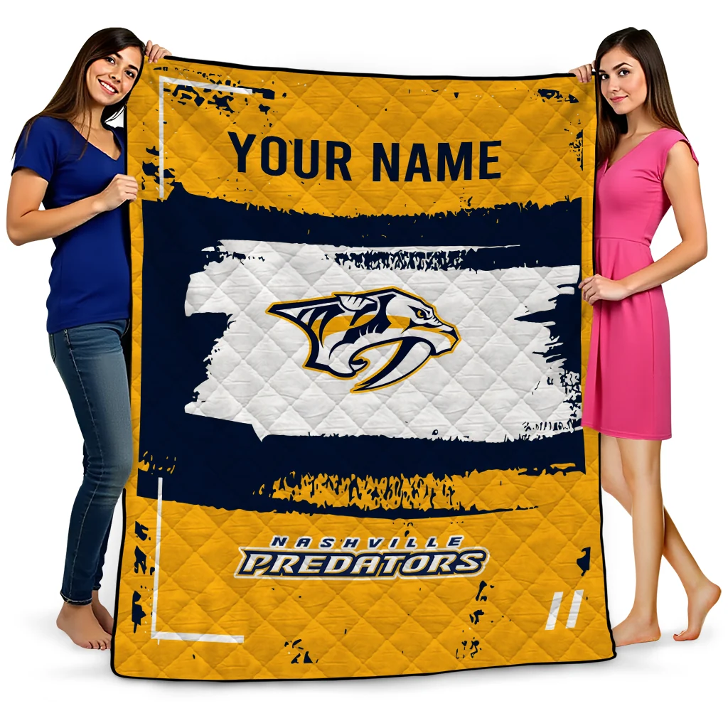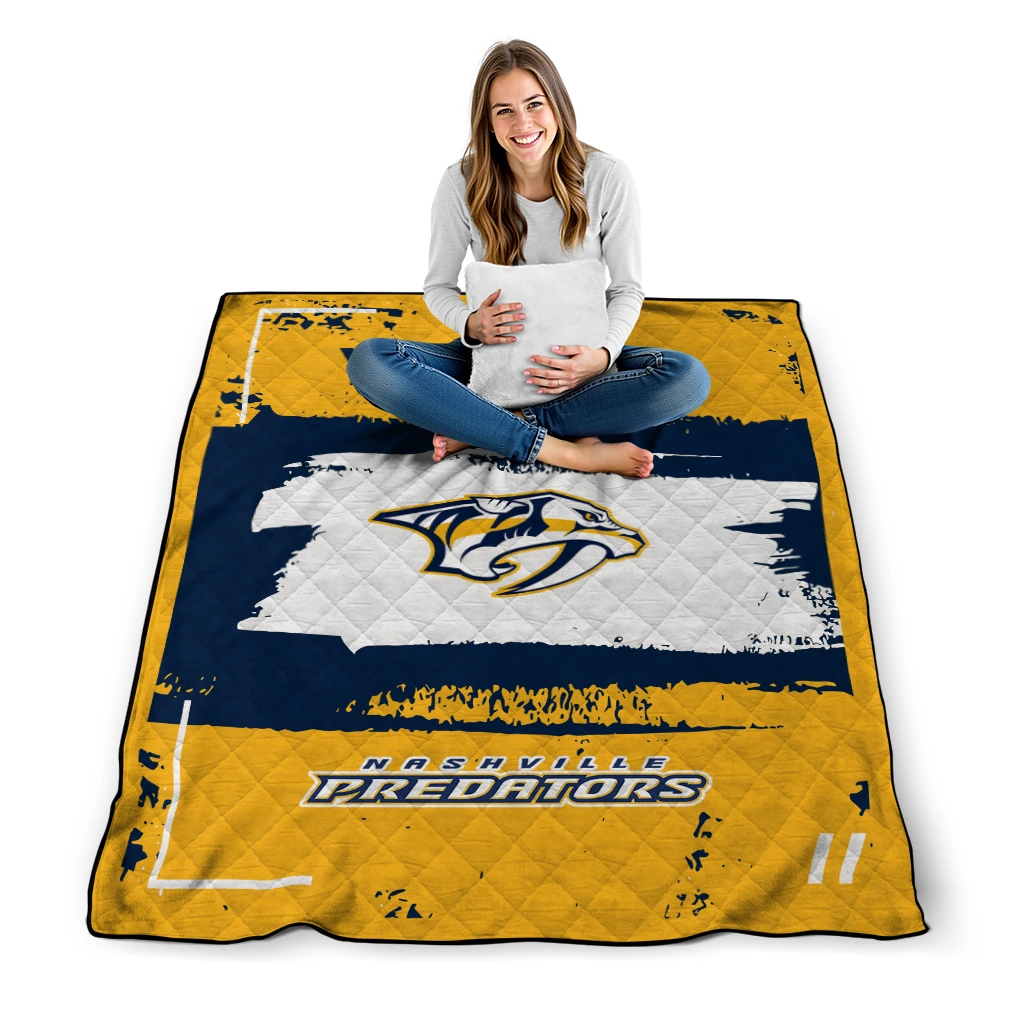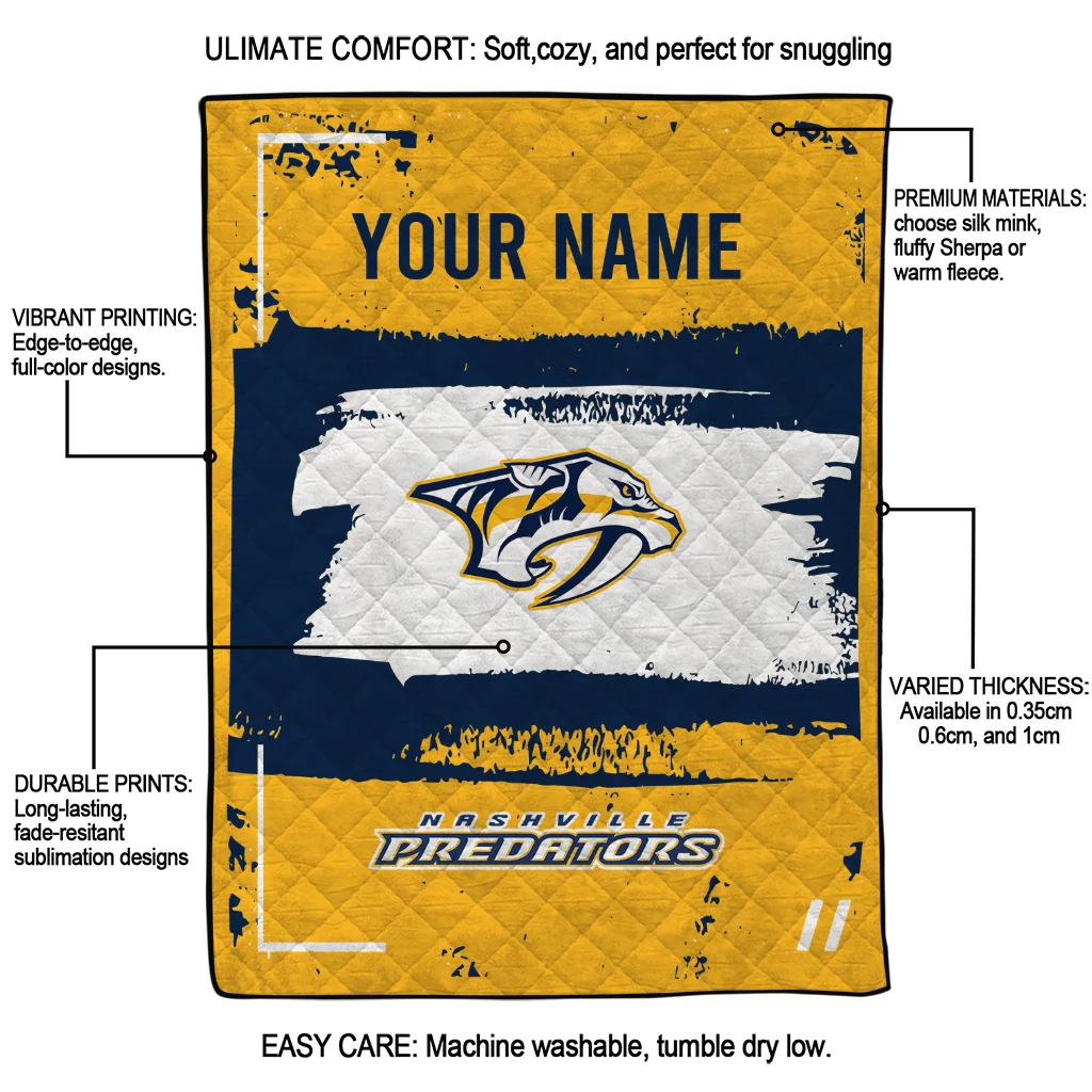 The Customized Nashville Predators Grunge Patch Gold White Quilt Blanket is more than a blanket—it’s everyday comfort, thoughtfully made. Crafted from premium quilting fabric with a soft microfiber touch, it offers a smooth hand-feel and lasting coziness. Layered quilting with a cotton-filled core provides adaptable warmth across seasons while maintaining a clean, tailored look on your bed or sofa.