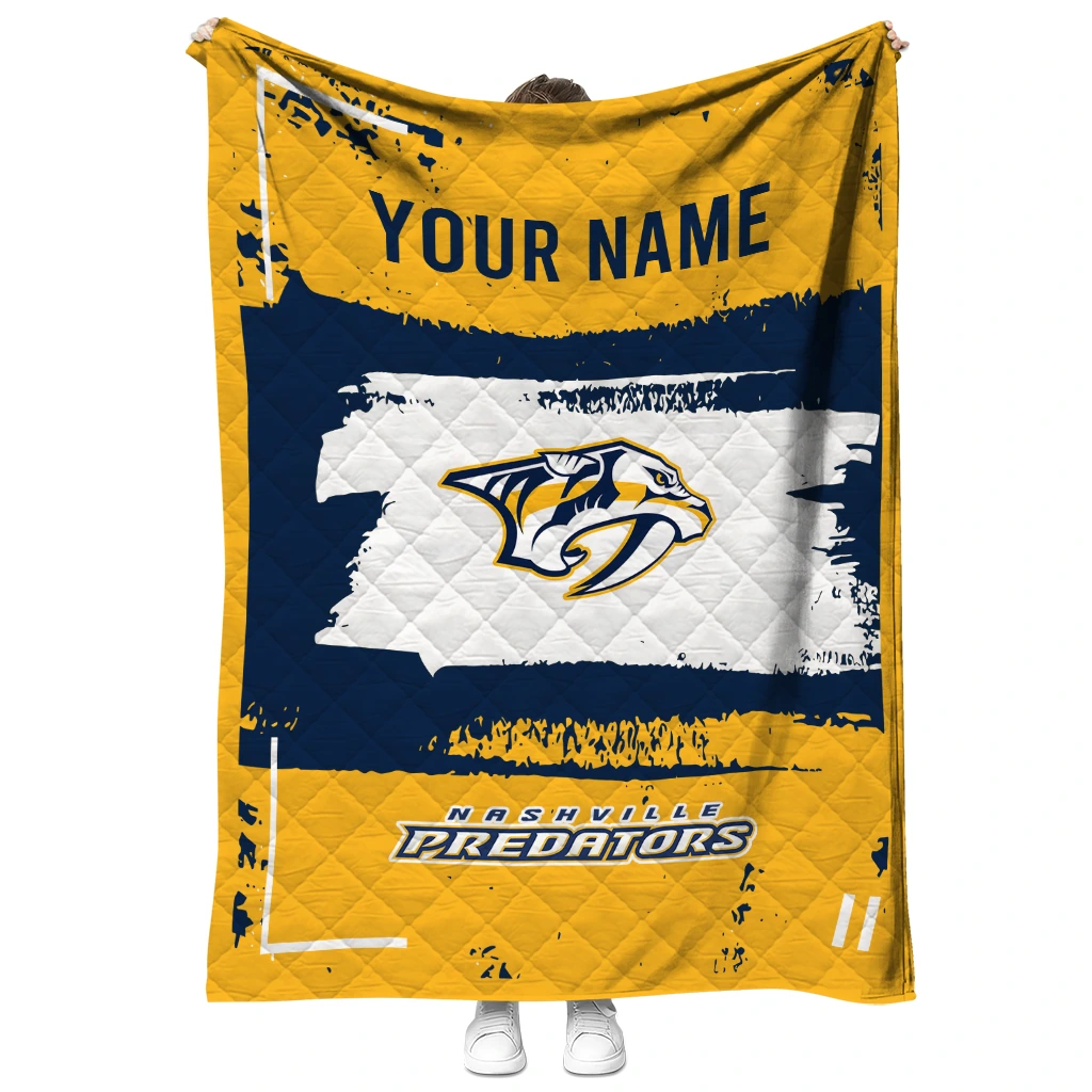 Wrap yourself in warmth and pride with the Customized Nashville Predators Grunge Patch Gold White Quilt Blanket from the Nashville Predators Blankets collection at Yes That Blanket. Made from 100% premium quilting-weight polyester blended with a touch of microfiber, this quilt offers a smooth, soft finish you’ll love. Choose between two quilting styles—Stipple or Diagonal—and enjoy the comfort of a cotton-filled layer inside that adds extra coziness for every season. The border is available in classic black or white, giving your design a clean, timeless edge.
