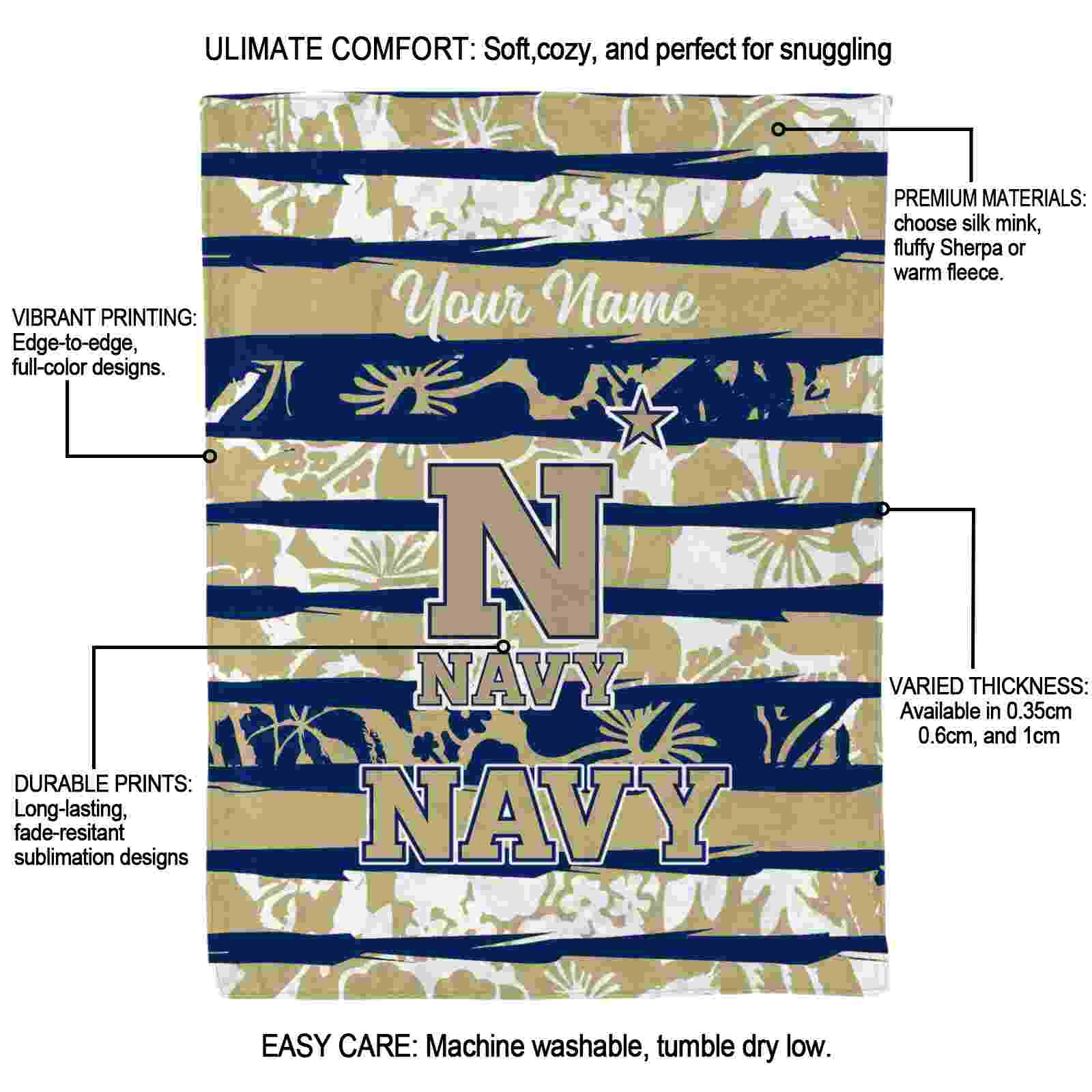 Without a doubt, the Customized Navy Midshipmen Floral Stripes Blue White Blanket from Navy Midshipmen Blankets collection is offering true fans a chance to showcase passion in a cool way. Personalize it with your favorite team's logo or a meaningful name to make it uniquely yours. Isn't that great? The full-color print ensures vibrant, edge-to-edge designs, bringing your sports enthusiasm to life!