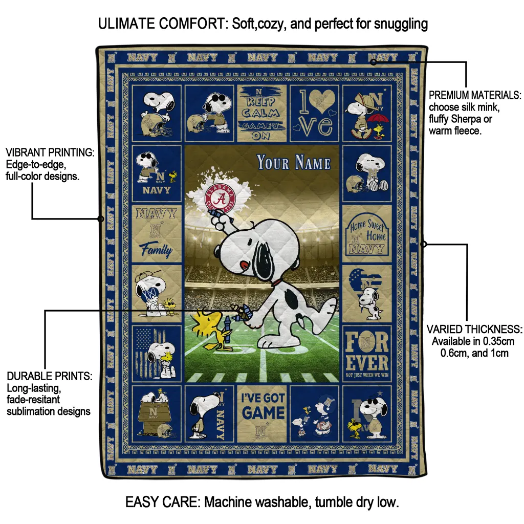 Wrap yourself in warmth and pride with the Customized Navy Midshipmen Snoopy Coach Blue Quilt Blanket from the Navy Midshipmen Blankets collection at Yes That Blanket. Made from 100% premium quilting-weight polyester blended with a touch of microfiber, this quilt offers a smooth, soft finish you’ll love. Choose between two quilting styles—Stipple or Diagonal—and enjoy the comfort of a cotton-filled layer inside that adds extra coziness for every season. The border is available in classic black or white, giving your design a clean, timeless edge.