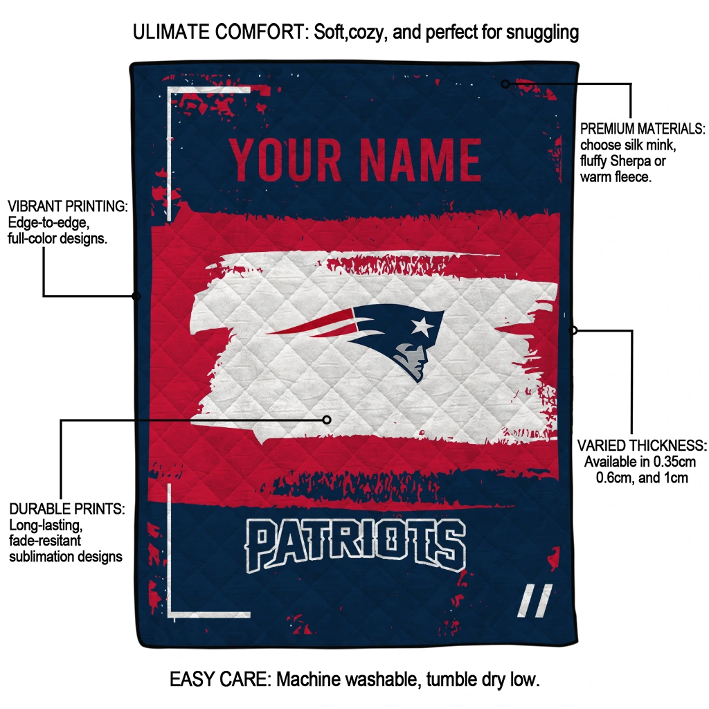 Wrap yourself in warmth and pride with the Customized New England Patriots Grunge Patch Blue White Quilt Blanket from the New England Patriots Blankets collection at Yes That Blanket. Made from 100% premium quilting-weight polyester blended with a touch of microfiber, this quilt offers a smooth, soft finish you’ll love. Choose between two quilting styles—Stipple or Diagonal—and enjoy the comfort of a cotton-filled layer inside that adds extra coziness for every season. The border is available in classic black or white, giving your design a clean, timeless edge.