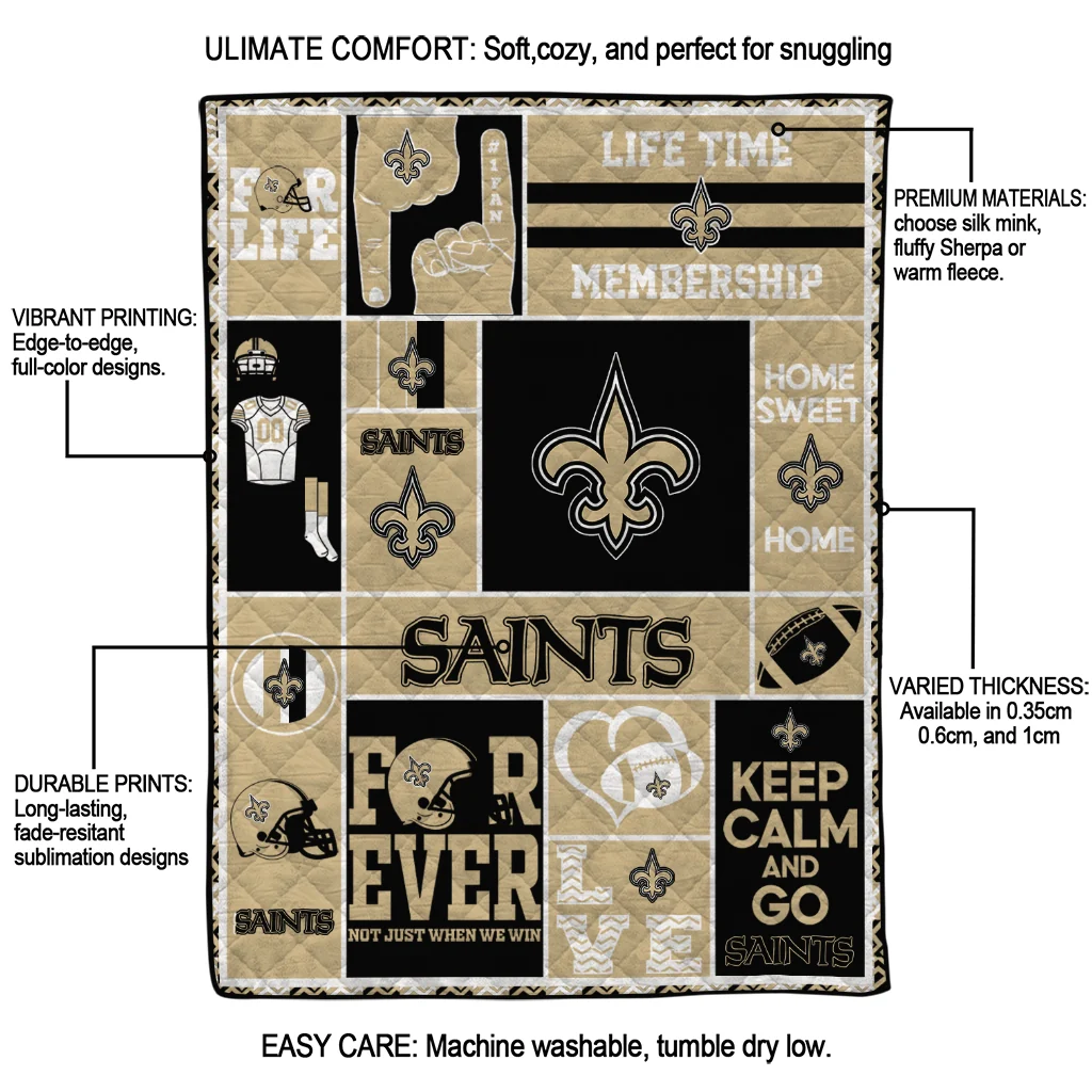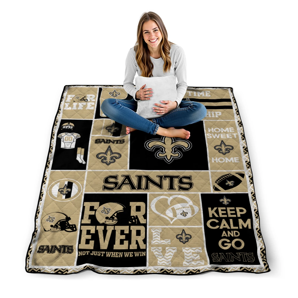 The Customized New Orleans Saints Helmet Passion Gold Quilt Blanket is more than a blanket—it’s everyday comfort, thoughtfully made. Crafted from premium quilting fabric with a soft microfiber touch, it offers a smooth hand-feel and lasting coziness. Layered quilting with a cotton-filled core provides adaptable warmth across seasons while maintaining a clean, tailored look on your bed or sofa.