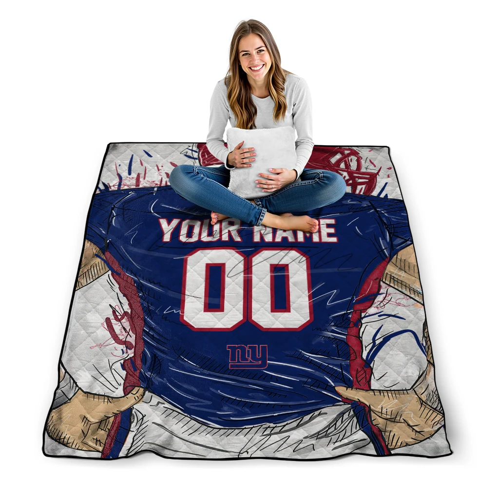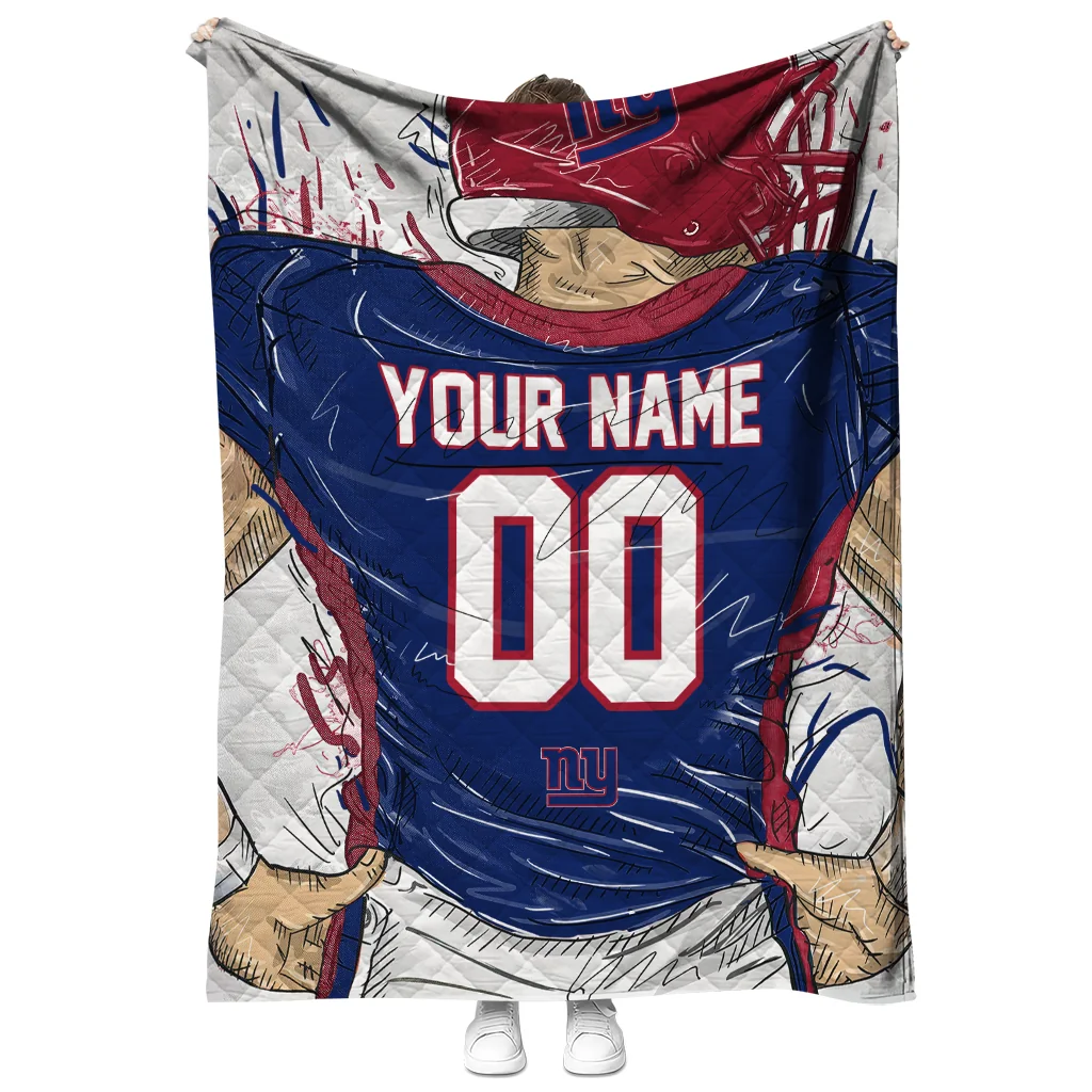 Customized New York Giants Player Sketch Blue Gray Quilt Blanket