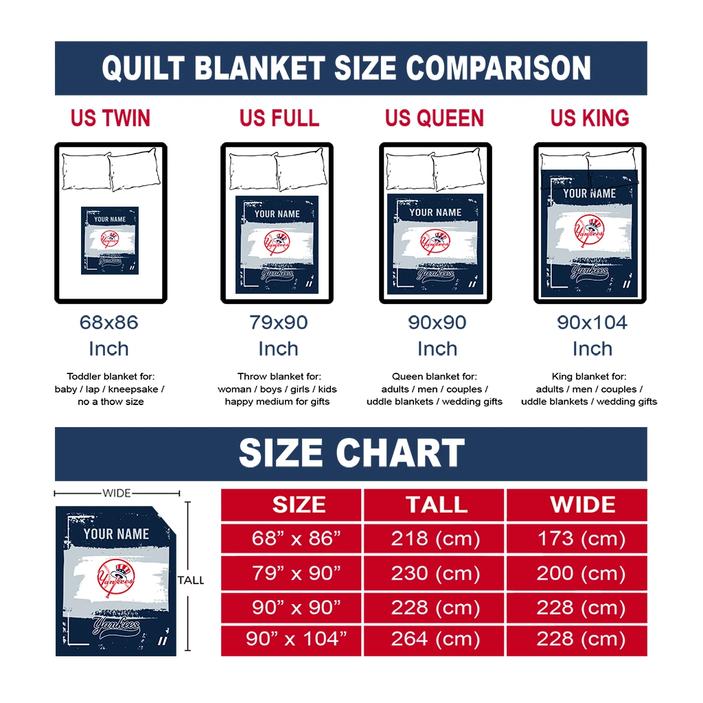 Wrap yourself in warmth and pride with the Customized New York Yankees Grunge Patch Navy White Quilt Blanket from the New York Yankees Blankets collection at Yes That Blanket. Made from 100% premium quilting-weight polyester blended with a touch of microfiber, this quilt offers a smooth, soft finish you’ll love. Choose between two quilting styles—Stipple or Diagonal—and enjoy the comfort of a cotton-filled layer inside that adds extra coziness for every season. The border is available in classic black or white, giving your design a clean, timeless edge.