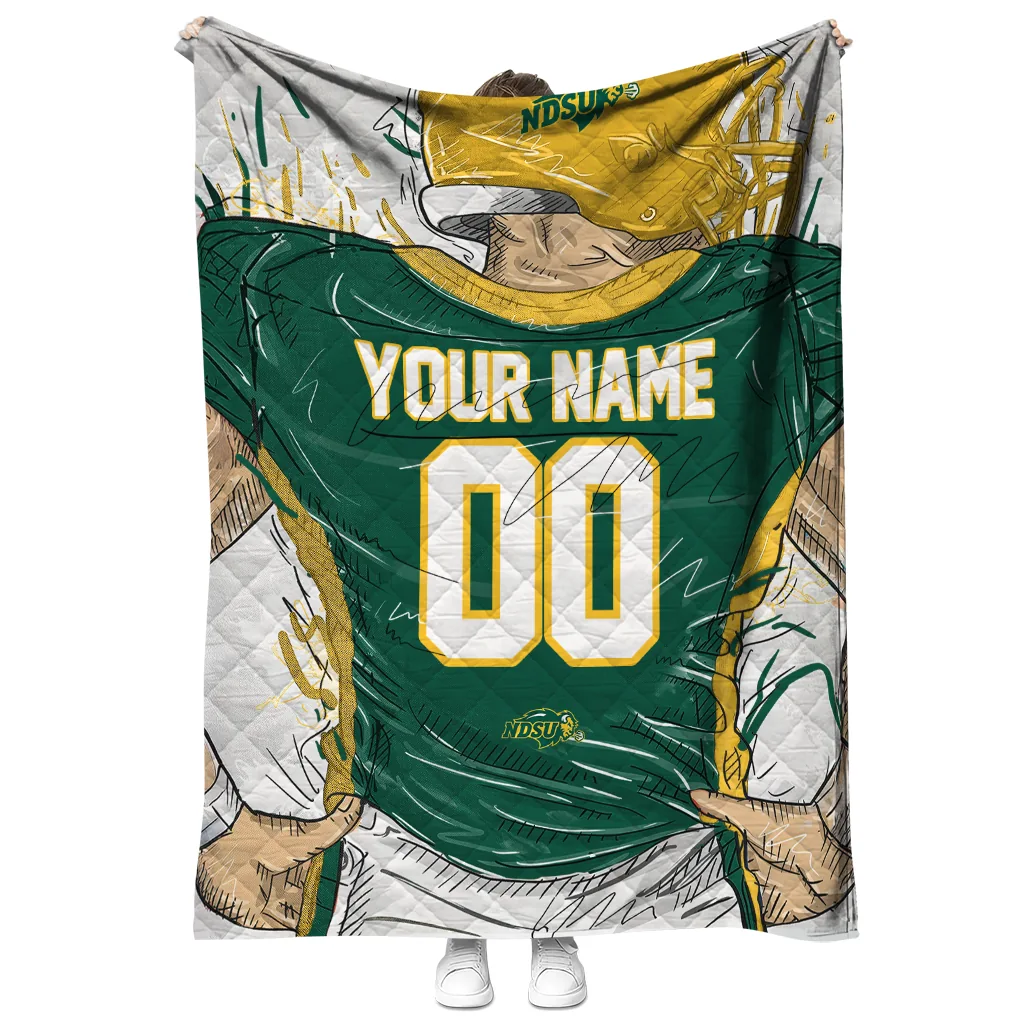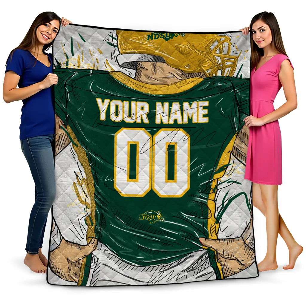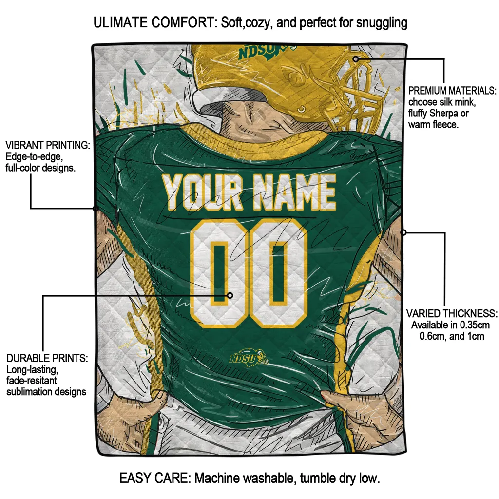 Customized North Dakota State Bison Player Sketch Green Gray Quilt Blanket