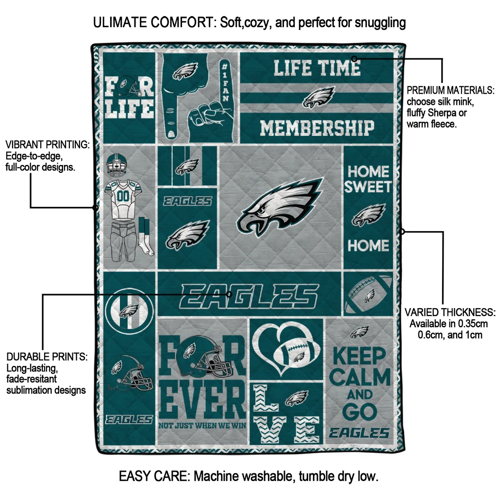 The Customized Philadelphia Eagles Helmet Passion Green Quilt Blanket is more than a blanket—it’s everyday comfort, thoughtfully made. Crafted from premium quilting fabric with a soft microfiber touch, it offers a smooth hand-feel and lasting coziness. Layered quilting with a cotton-filled core provides adaptable warmth across seasons while maintaining a clean, tailored look on your bed or sofa.