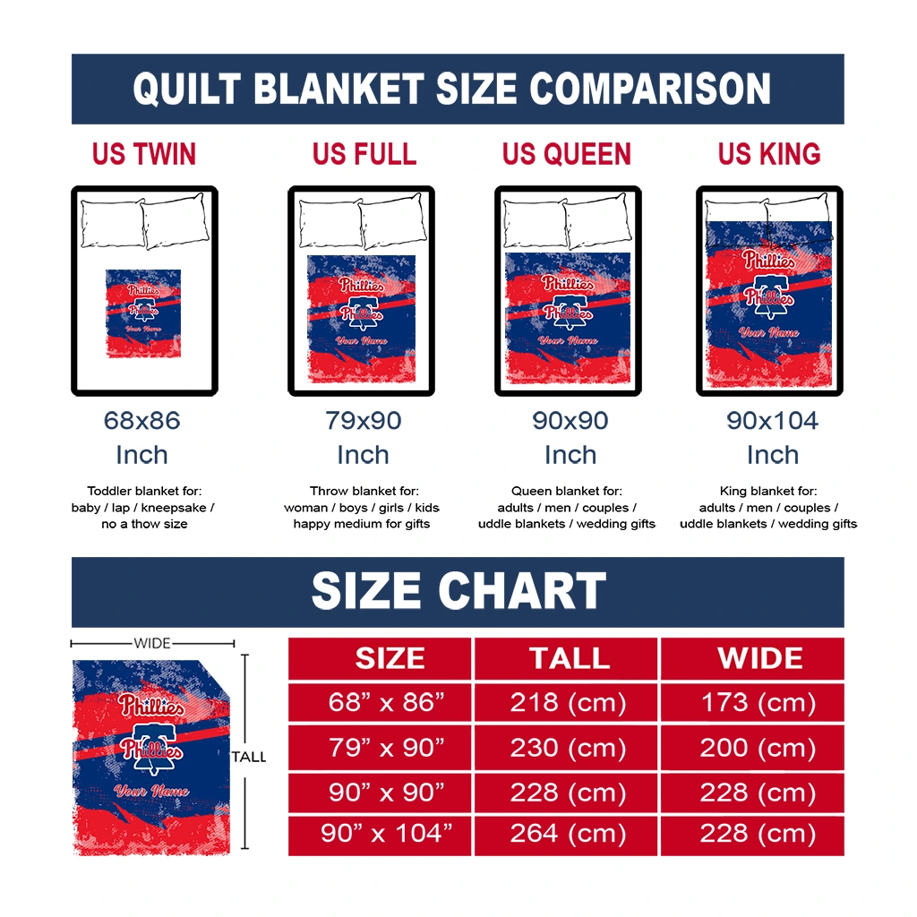 Wrap yourself in warmth and pride with the Customized Philadelphia Phillies Brushstroke Layers Blue Quilt Blanket from the Philadelphia Phillies Blankets collection at Yes That Blanket. Made from 100% premium quilting-weight polyester blended with a touch of microfiber, this quilt offers a smooth, soft finish you’ll love. Choose between two quilting styles—Stipple or Diagonal—and enjoy the comfort of a cotton-filled layer inside that adds extra coziness for every season. The border is available in classic black or white, giving your design a clean, timeless edge.