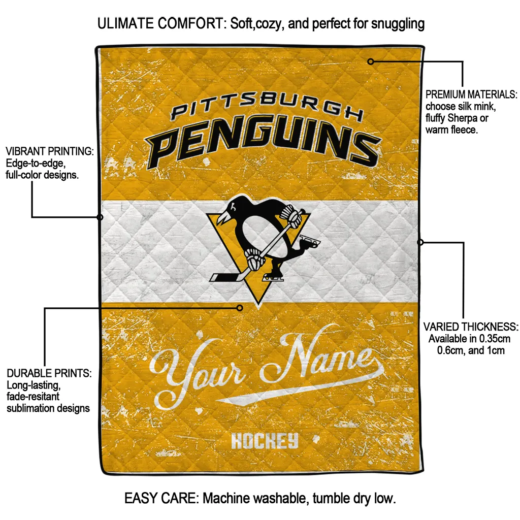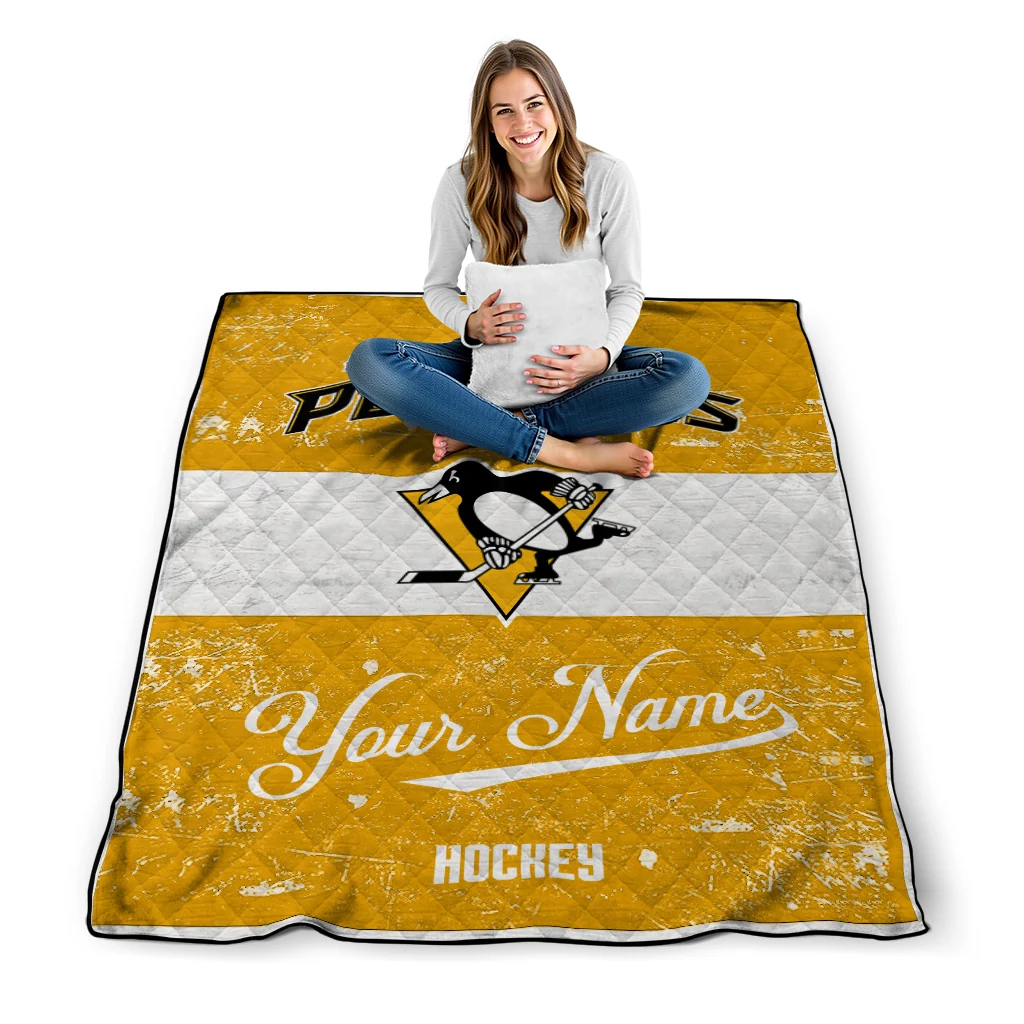 Customized Pittsburgh Penguins Pinstripe Lines Yellow White Quilt Blanket
