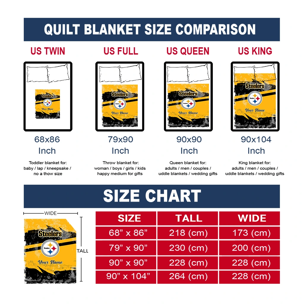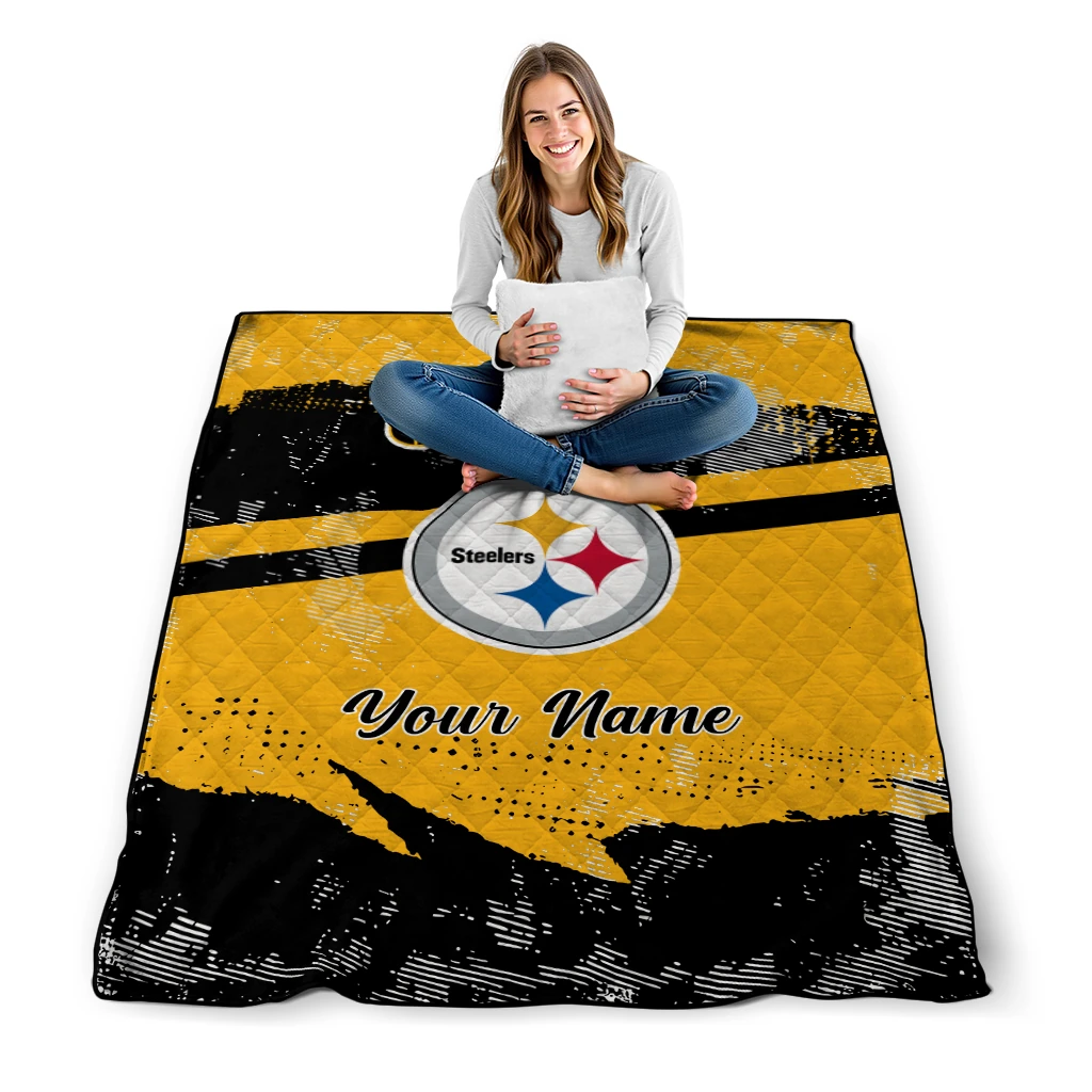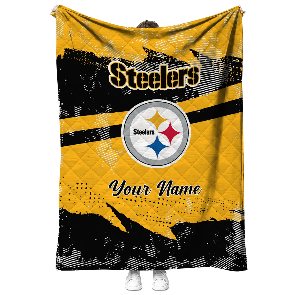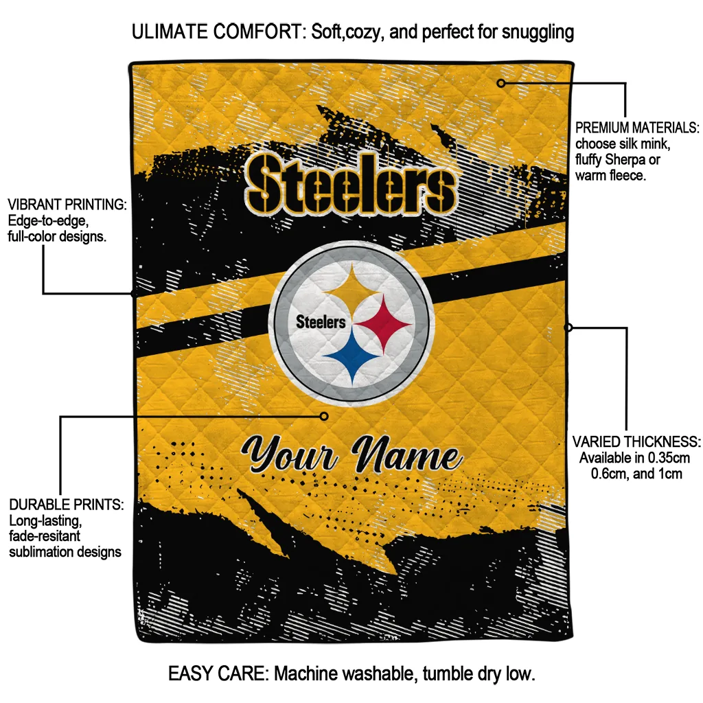 Wrap yourself in warmth and pride with the Customized Pittsburgh Steelers Brushstroke Layers Gold Quilt Blanket from the Pittsburgh Steelers Blankets collection at Yes That Blanket. Made from 100% premium quilting-weight polyester blended with a touch of microfiber, this quilt offers a smooth, soft finish you’ll love. Choose between two quilting styles—Stipple or Diagonal—and enjoy the comfort of a cotton-filled layer inside that adds extra coziness for every season. The border is available in classic black or white, giving your design a clean, timeless edge.