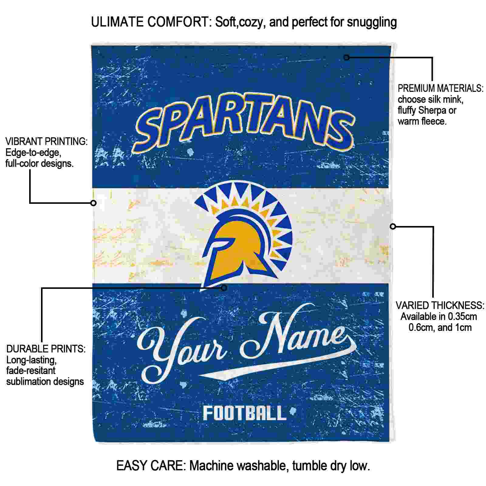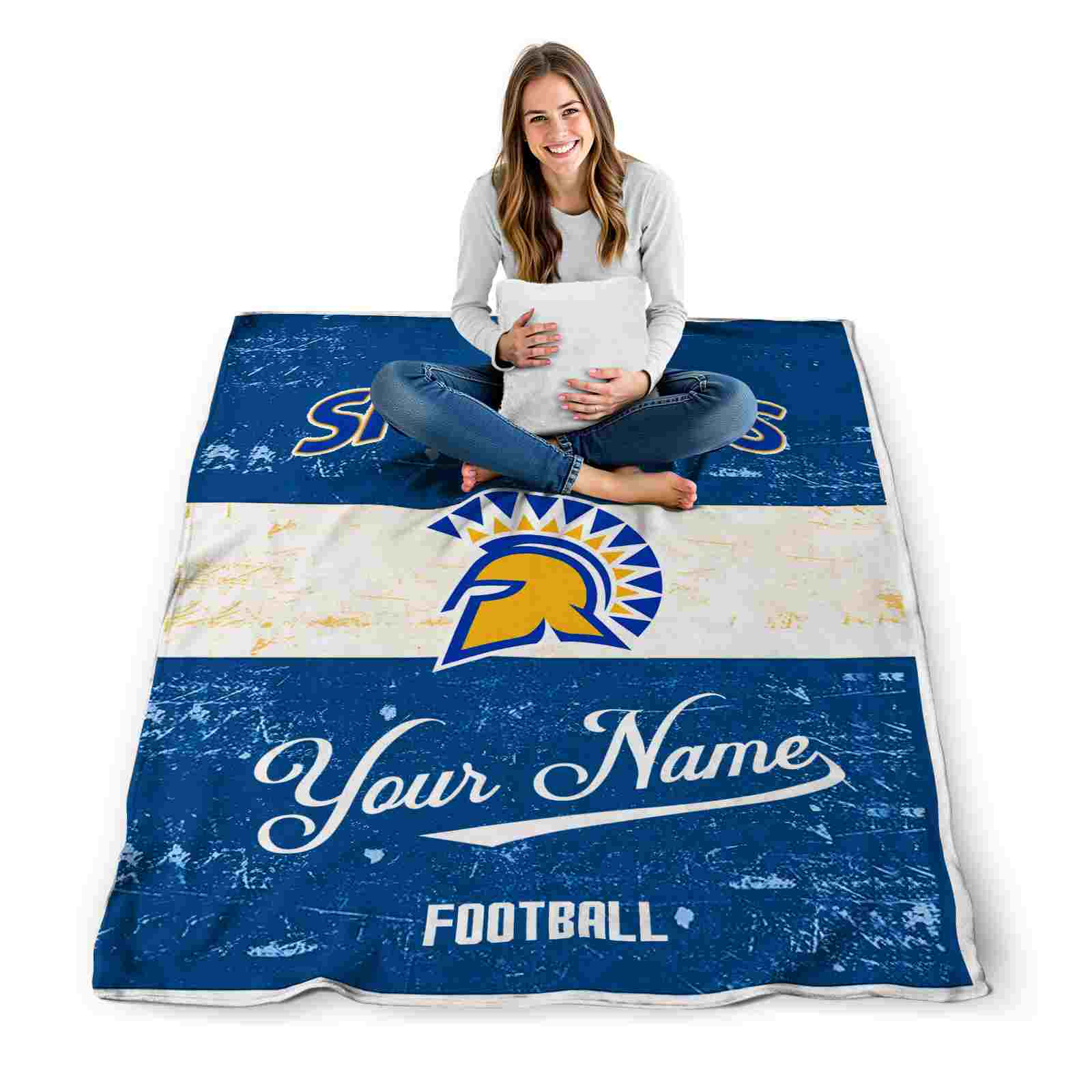 Without a doubt, the Customized San Jose State Spartans Grunge Texture Blue White Blanket from San Jose State Spartans Blankets collection is offering true fans a chance to showcase passion in a cool way. Personalize it with your favorite team’s logo or a meaningful name to make it uniquely yours. Isn’t that great? The full-color print ensures vibrant, edge-to-edge designs, bringing your sports enthusiasm to life!