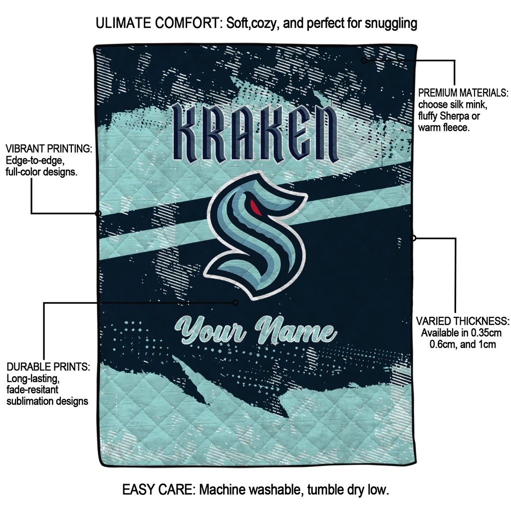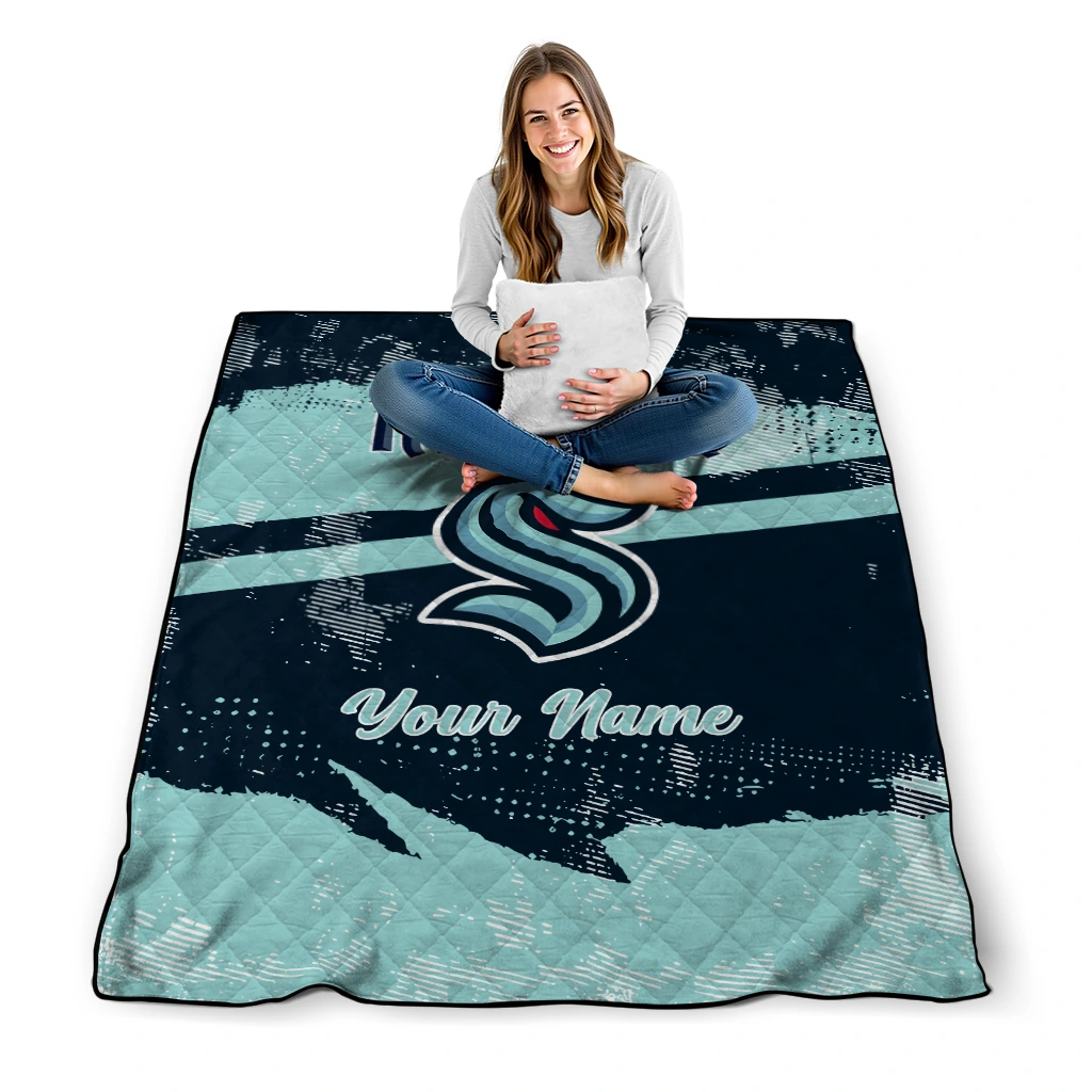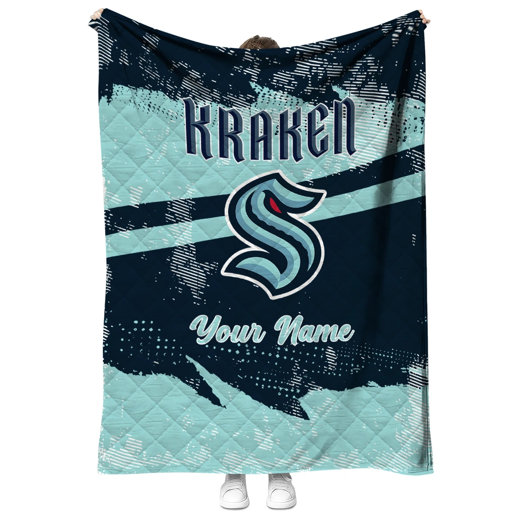 Wrap yourself in warmth and pride with the Customized Seattle Kraken Brushstroke Layers Blue Quilt Blanket from the Seattle Kraken Blankets collection at Yes That Blanket. Made from 100% premium quilting-weight polyester blended with a touch of microfiber, this quilt offers a smooth, soft finish you’ll love. Choose between two quilting styles—Stipple or Diagonal—and enjoy the comfort of a cotton-filled layer inside that adds extra coziness for every season. The border is available in classic black or white, giving your design a clean, timeless edge.