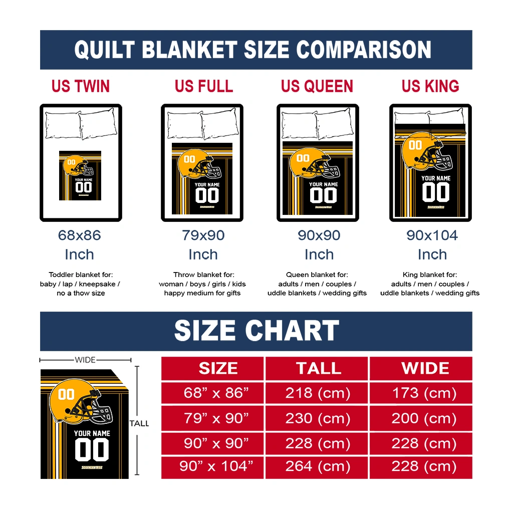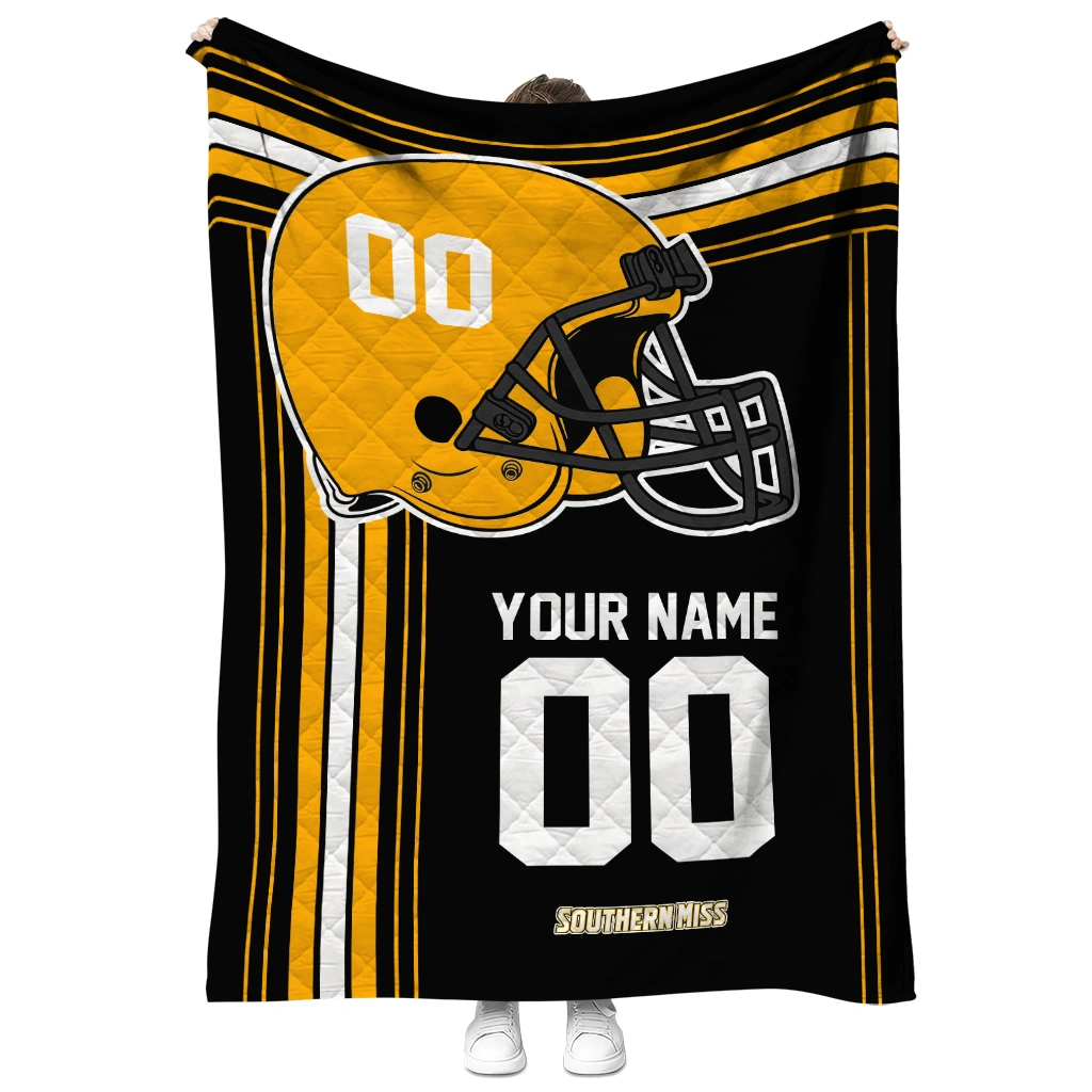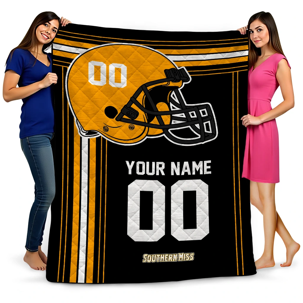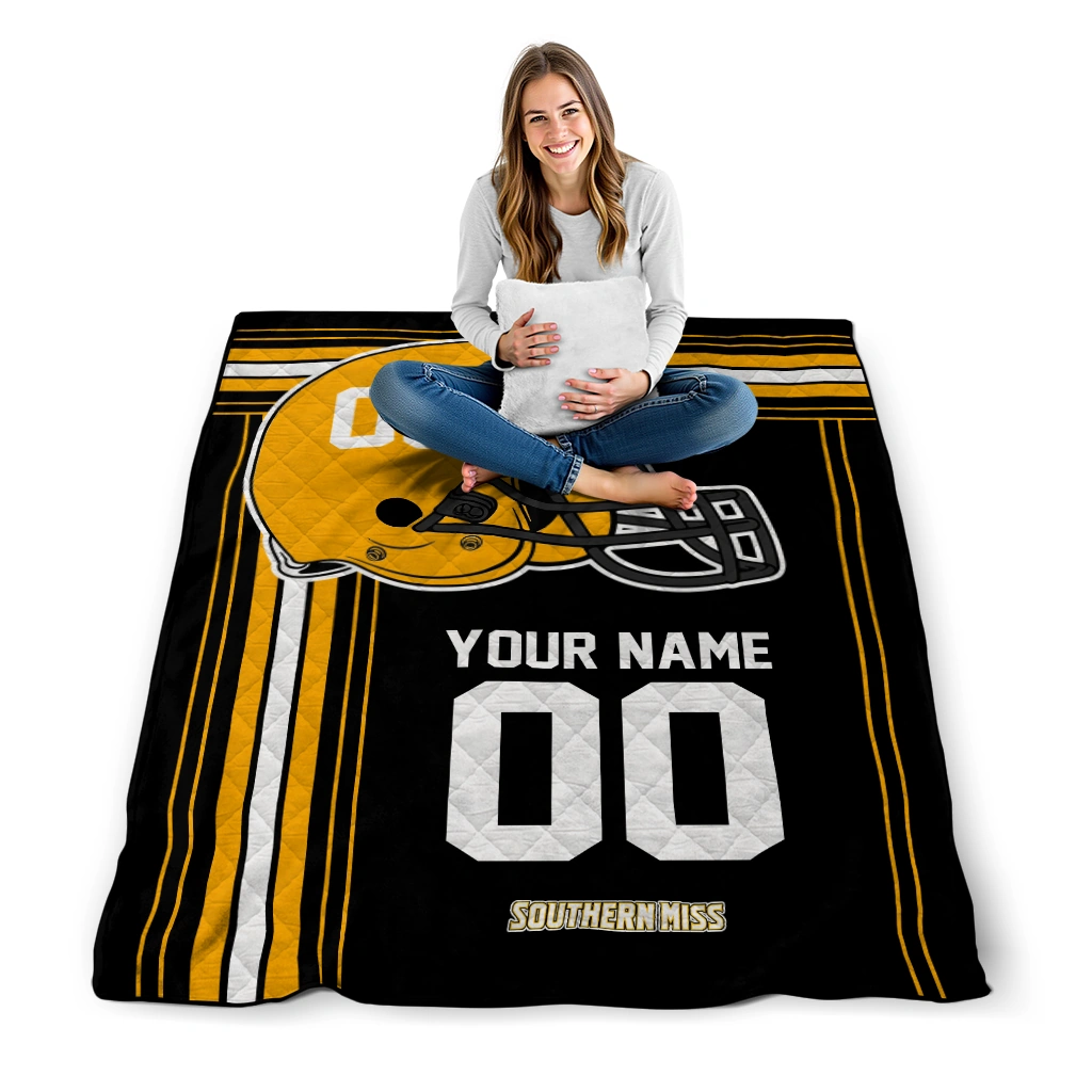 Wrap yourself in warmth and pride with the Customized Southern Miss Golden Eagles Helmet Theme Black Quilt Blanket from the Southern Miss Golden Eagles Blankets collection at Yes That Blanket. Made from 100% premium quilting-weight polyester blended with a touch of microfiber, this quilt offers a smooth, soft finish you’ll love. Choose between two quilting styles—Stipple or Diagonal—and enjoy the comfort of a cotton-filled layer inside that adds extra coziness for every season. The border is available in classic black or white, giving your design a clean, timeless edge.