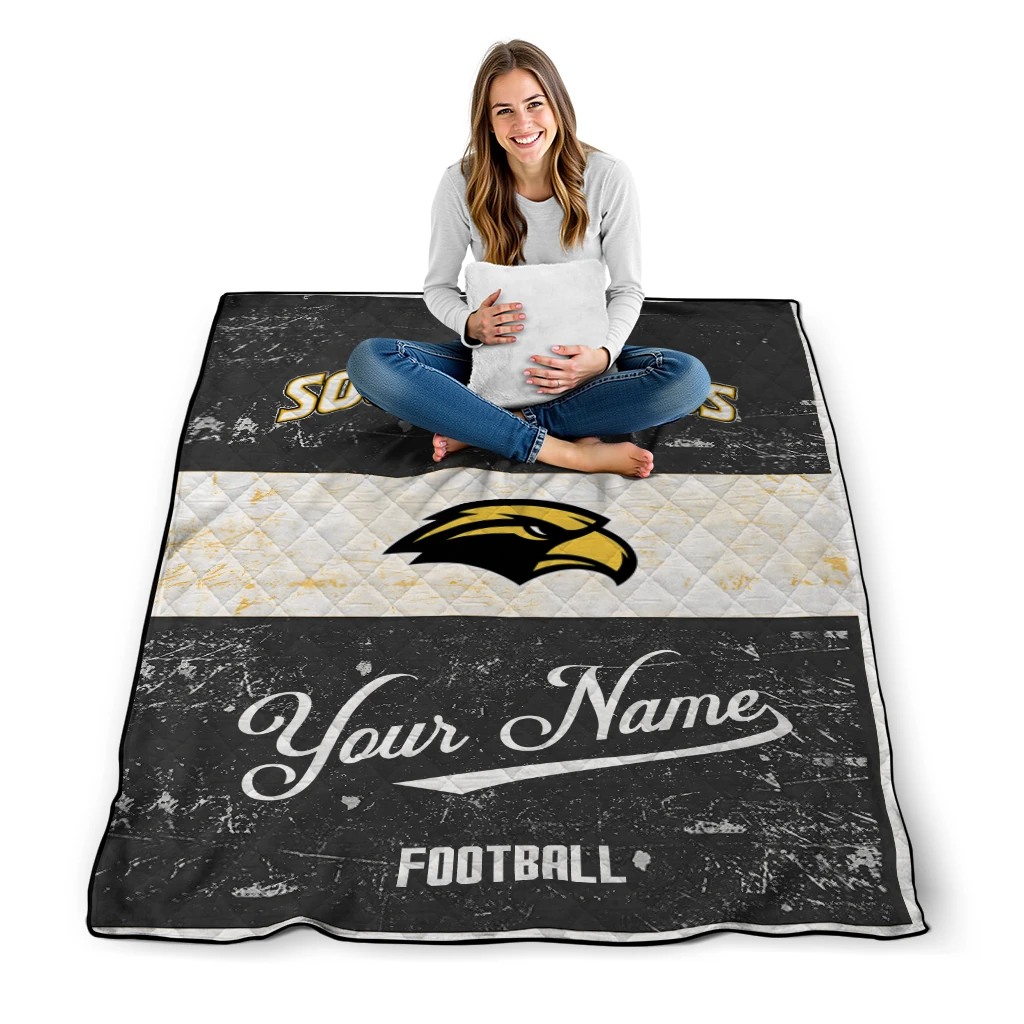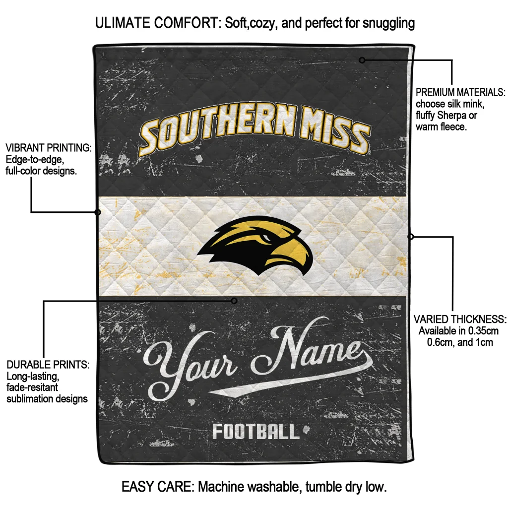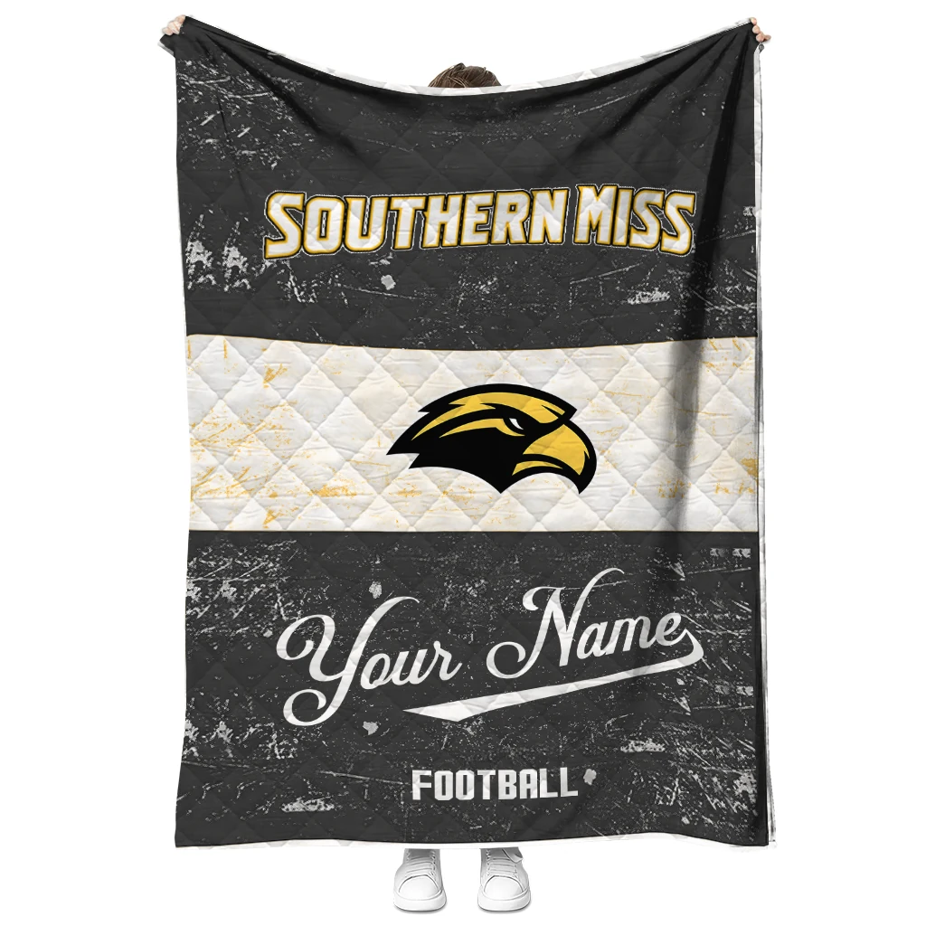 Customized Southern Miss Golden Eagles Hibiscus Burst Black White Quilt Blanket