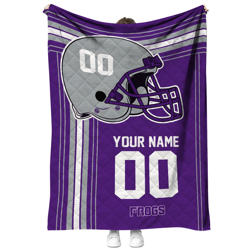 Wrap yourself in warmth and pride with the Customized TCU Horned Frogs Helmet Theme Purple Quilt Blanket from the TCU Horned Frogs Blankets collection at Yes That Blanket. Made from 100% premium quilting-weight polyester blended with a touch of microfiber, this quilt offers a smooth, soft finish you’ll love. Choose between two quilting styles—Stipple or Diagonal—and enjoy the comfort of a cotton-filled layer inside that adds extra coziness for every season. The border is available in classic black or white, giving your design a clean, timeless edge.