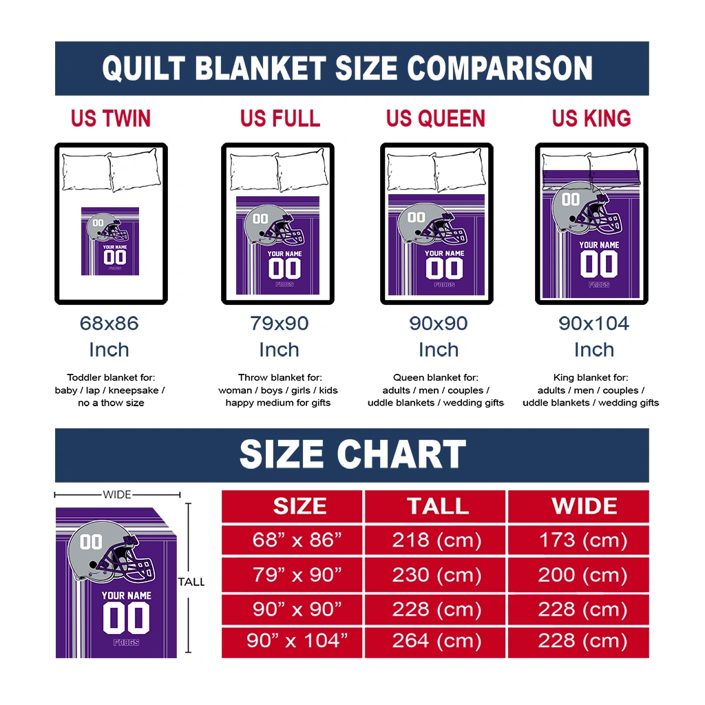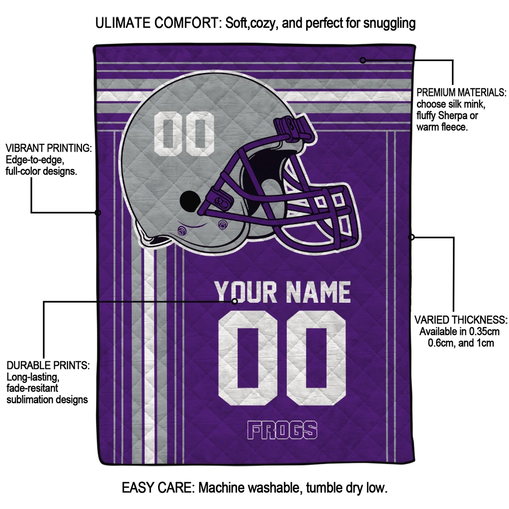 The Customized TCU Horned Frogs Helmet Theme Purple Quilt Blanket is more than a blanket—it’s everyday comfort, thoughtfully made. Crafted from premium quilting fabric with a soft microfiber touch, it offers a smooth hand-feel and lasting coziness. Layered quilting with a cotton-filled core provides adaptable warmth across seasons while maintaining a clean, tailored look on your bed or sofa.