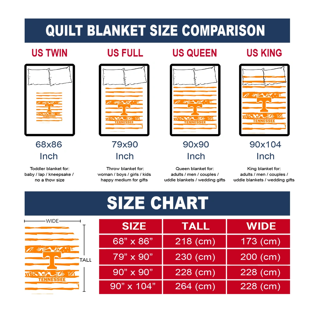 The Customized Tennessee Volunteers Layered Florals Orange White Quilt Blanket is more than a blanket—it’s everyday comfort, thoughtfully made. Crafted from premium quilting fabric with a soft microfiber touch, it offers a smooth hand-feel and lasting coziness. Layered quilting with a cotton-filled core provides adaptable warmth across seasons while maintaining a clean, tailored look on your bed or sofa.