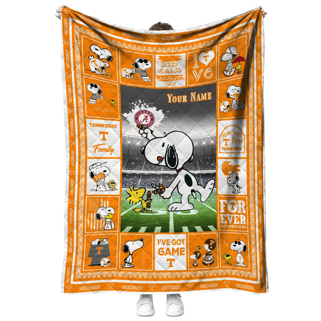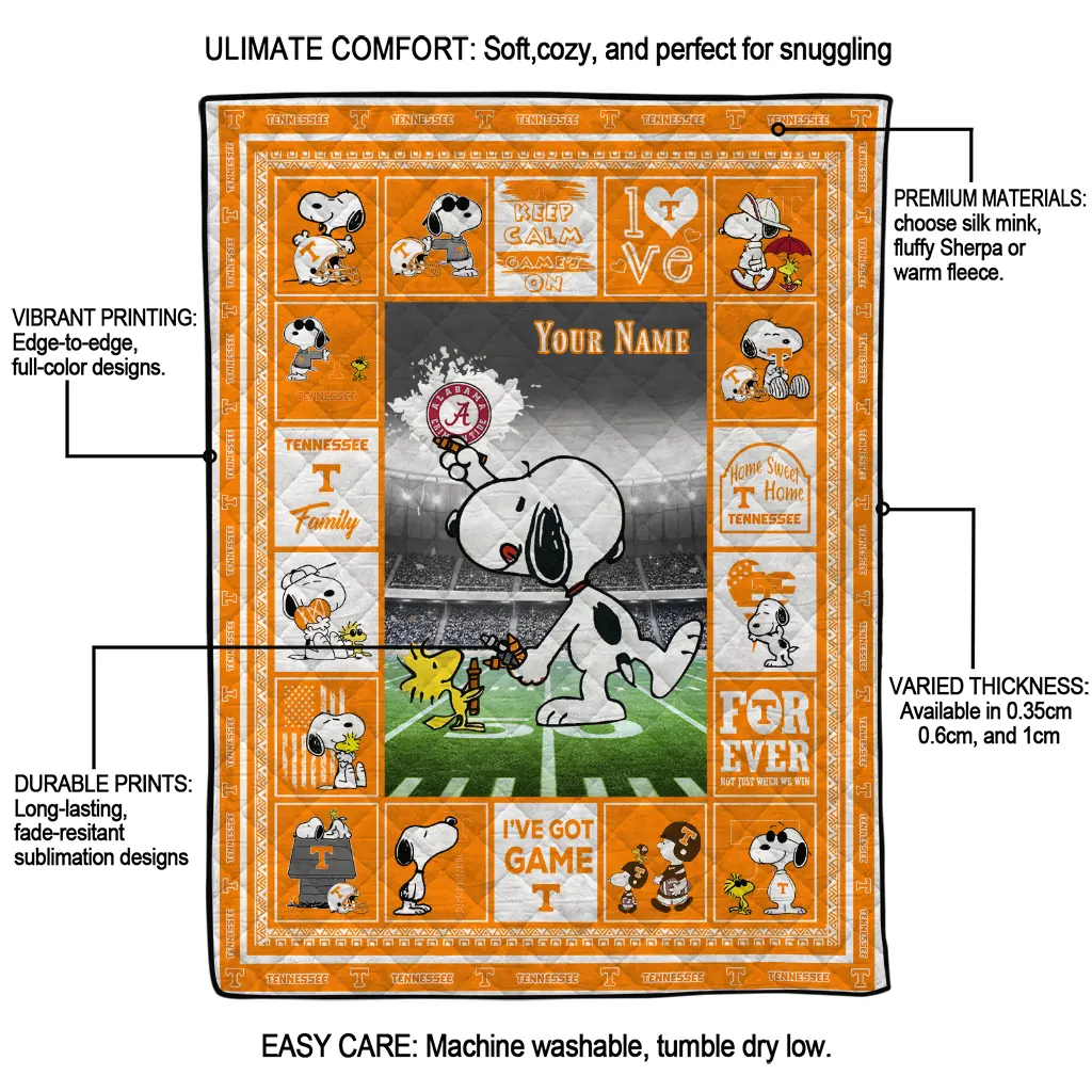 Wrap yourself in warmth and pride with the Customized Tennessee Volunteers Snoopy Coach Orange Quilt Blanket from the Tennessee Volunteers Blankets collection at Yes That Blanket. Made from 100% premium quilting-weight polyester blended with a touch of microfiber, this quilt offers a smooth, soft finish you’ll love. Choose between two quilting styles—Stipple or Diagonal—and enjoy the comfort of a cotton-filled layer inside that adds extra coziness for every season. The border is available in classic black or white, giving your design a clean, timeless edge.
