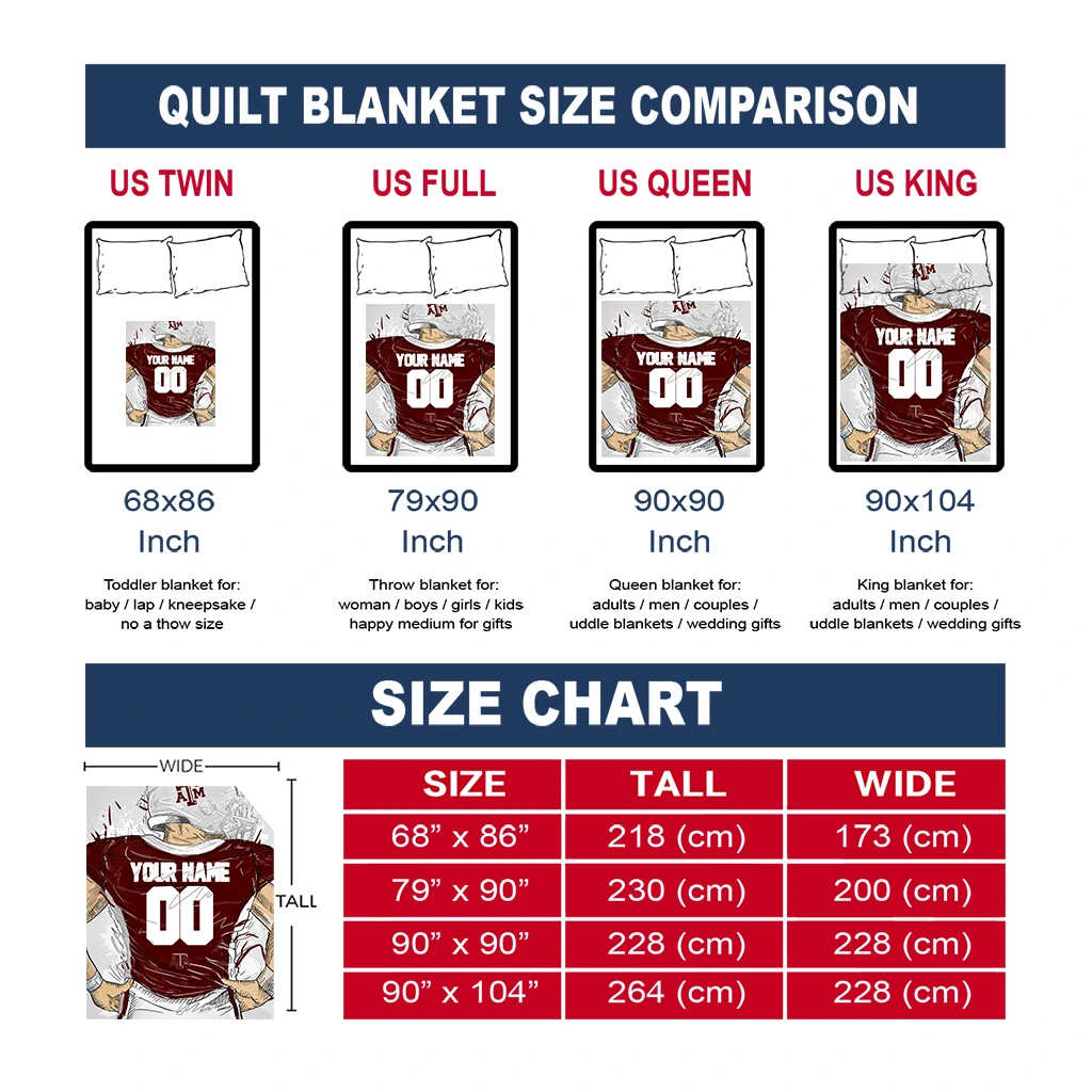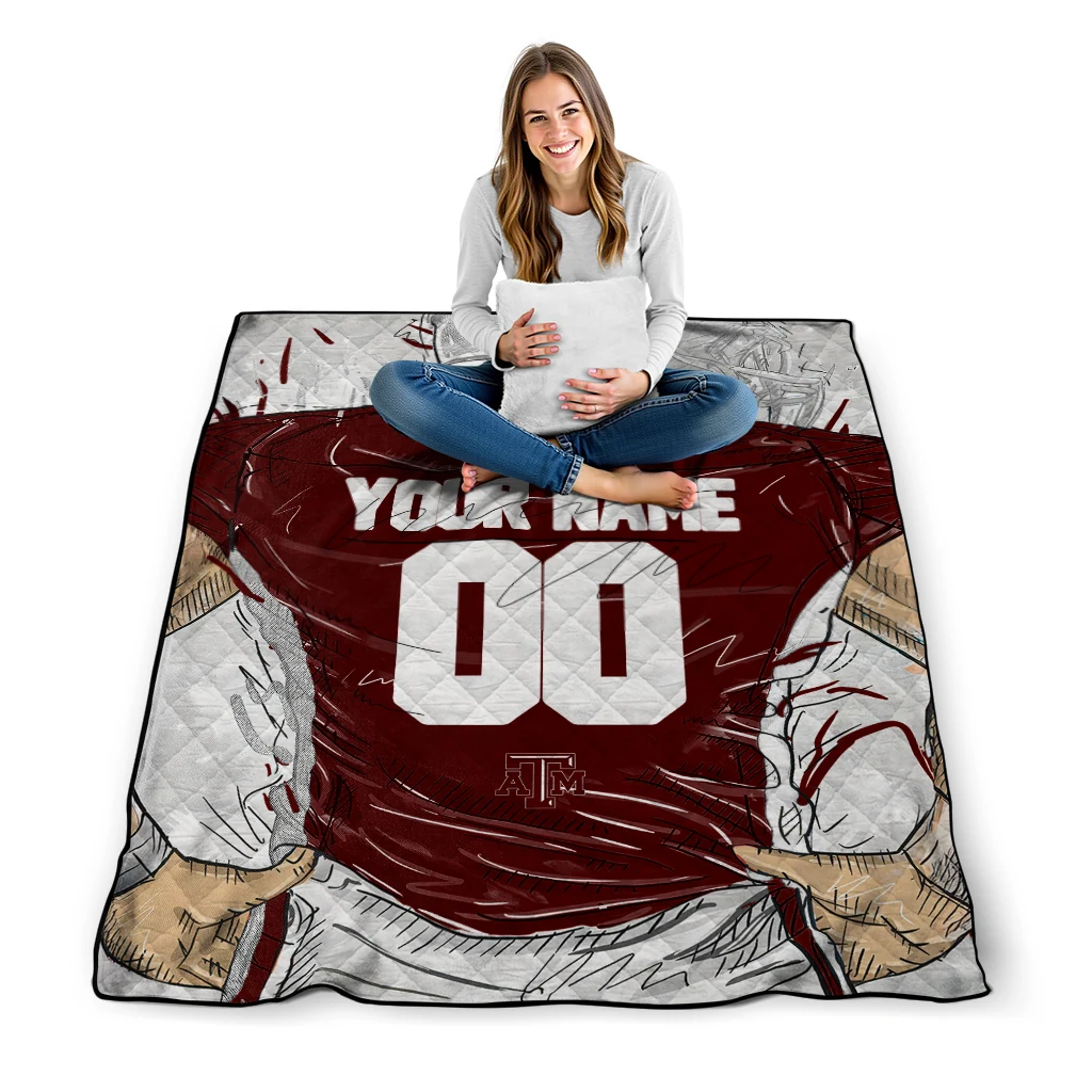 The Customized Texas A&M Aggies Player Sketch Maroon Gray Quilt Blanket is more than a blanket—it’s everyday comfort, thoughtfully made. Crafted from premium quilting fabric with a soft microfiber touch, it offers a smooth hand-feel and lasting coziness. Layered quilting with a cotton-filled core provides adaptable warmth across seasons while maintaining a clean, tailored look on your bed or sofa.