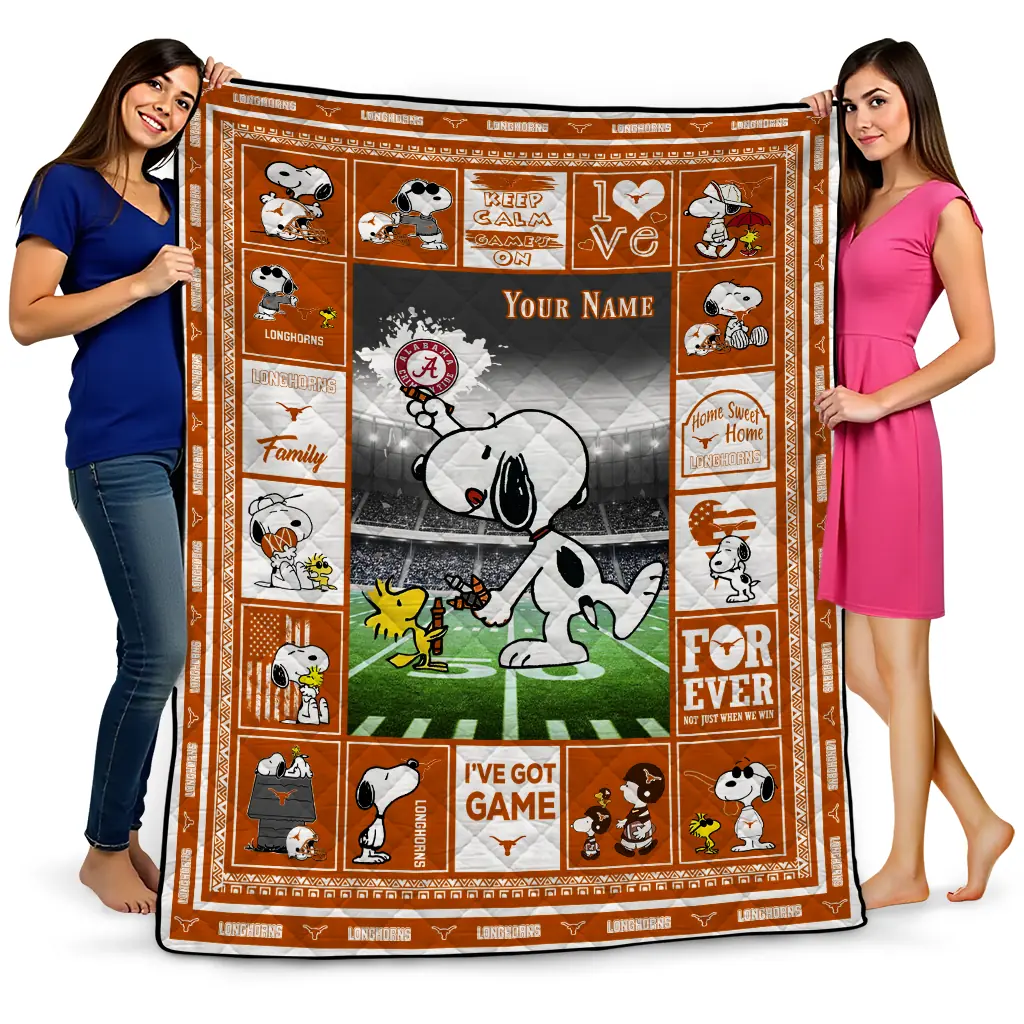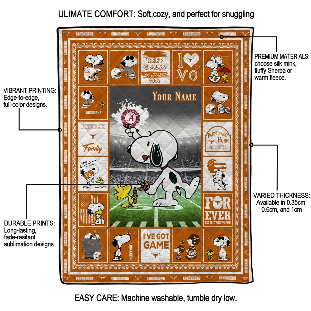 Wrap yourself in warmth and pride with the Customized Texas Longhorns Snoopy Coach Orange Quilt Blanket from the Texas Longhorns Blankets collection at Yes That Blanket. Made from 100% premium quilting-weight polyester blended with a touch of microfiber, this quilt offers a smooth, soft finish you’ll love. Choose between two quilting styles—Stipple or Diagonal—and enjoy the comfort of a cotton-filled layer inside that adds extra coziness for every season. The border is available in classic black or white, giving your design a clean, timeless edge.