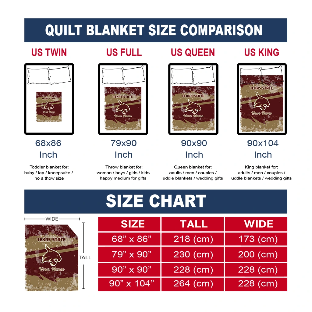 Wrap yourself in warmth and pride with the Customized Texas State Bobcats Brushstroke Layers Maroon Quilt Blanket from the Texas State Bobcats Blankets collection at Yes That Blanket. Made from 100% premium quilting-weight polyester blended with a touch of microfiber, this quilt offers a smooth, soft finish you’ll love. Choose between two quilting styles—Stipple or Diagonal—and enjoy the comfort of a cotton-filled layer inside that adds extra coziness for every season. The border is available in classic black or white, giving your design a clean, timeless edge.