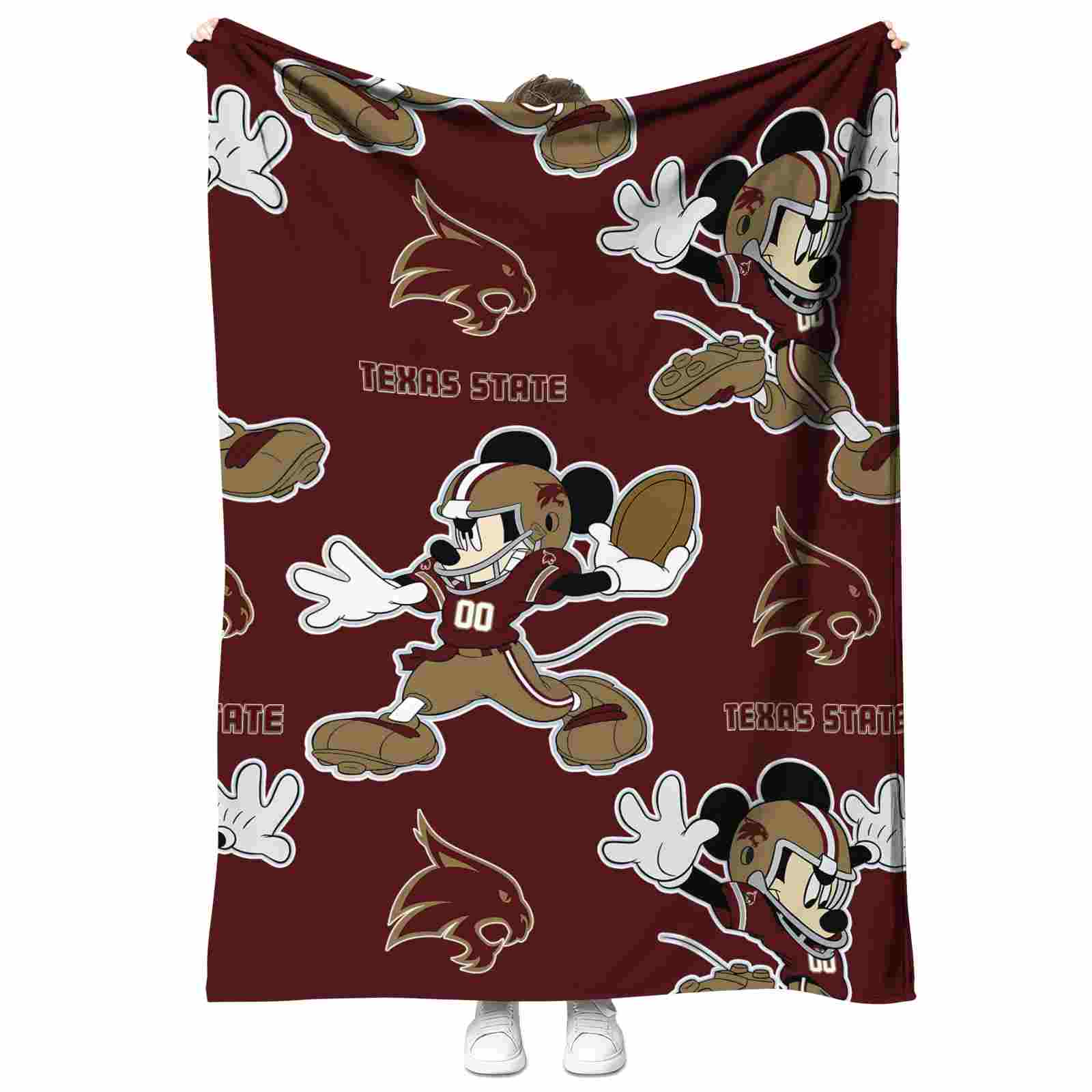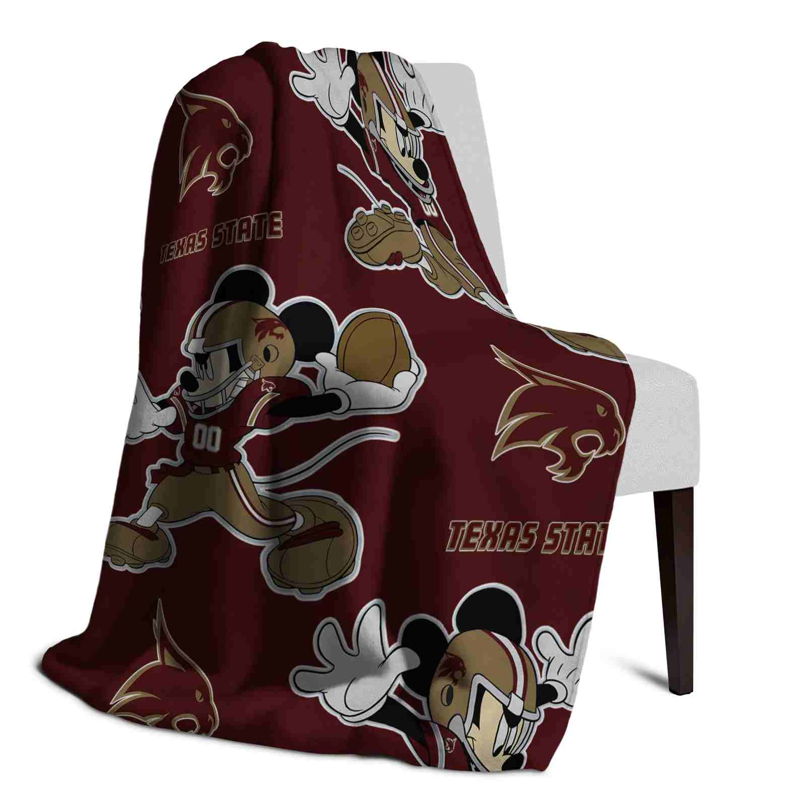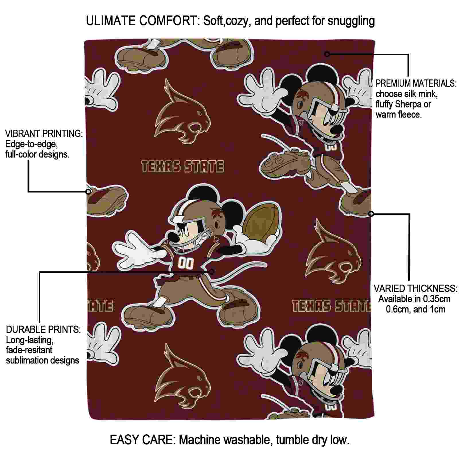 Without a doubt, the Customized Texas State Bobcats Mickey Maroon Blanket from Texas State Bobcats Blankets collection is offering true fans a chance to showcase passion in a cool way. Personalize it with your favorite team's logo or a meaningful name to make it uniquely yours. Isn't that great? The full-color print ensures vibrant, edge-to-edge designs, bringing your sports enthusiasm to life!