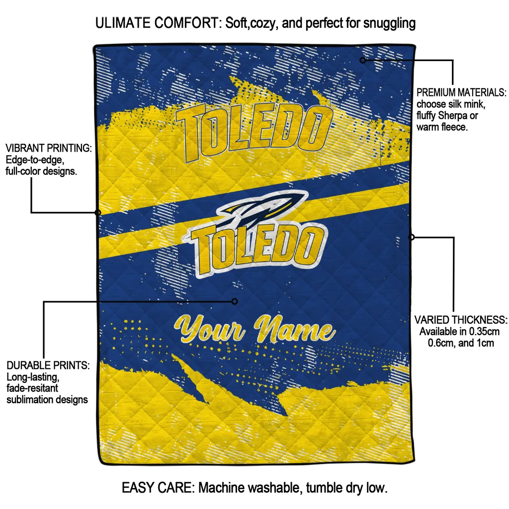 Wrap yourself in warmth and pride with the Customized Toledo Rockets Brushstroke Layers Blue Quilt Blanket from the Toledo Rockets Blankets collection at Yes That Blanket. Made from 100% premium quilting-weight polyester blended with a touch of microfiber, this quilt offers a smooth, soft finish you’ll love. Choose between two quilting styles—Stipple or Diagonal—and enjoy the comfort of a cotton-filled layer inside that adds extra coziness for every season. The border is available in classic black or white, giving your design a clean, timeless edge.