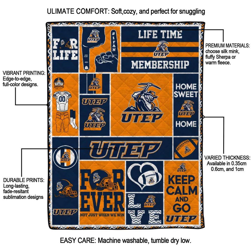 Wrap yourself in warmth and pride with the Customized UTEP Miners Helmet Passion Blue Quilt Blanket from the UTEP Miners Blankets collection at Yes That Blanket. Made from 100% premium quilting-weight polyester blended with a touch of microfiber, this quilt offers a smooth, soft finish you’ll love. Choose between two quilting styles—Stipple or Diagonal—and enjoy the comfort of a cotton-filled layer inside that adds extra coziness for every season. The border is available in classic black or white, giving your design a clean, timeless edge.