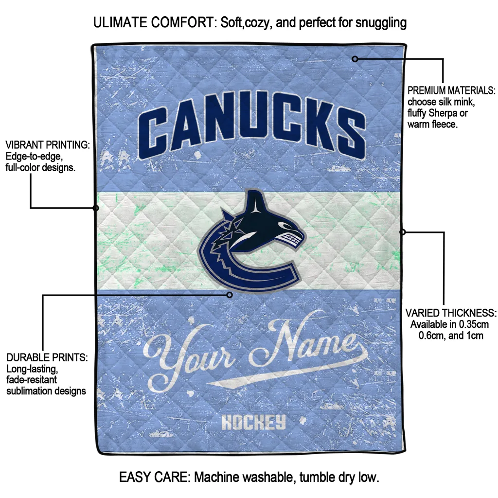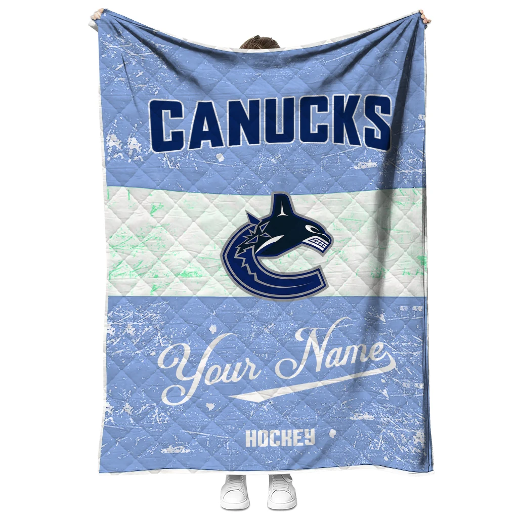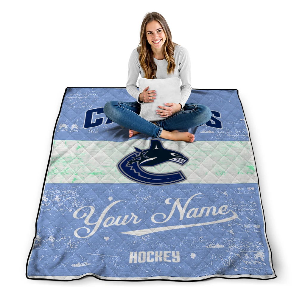 Wrap yourself in warmth and pride with the Customized Vancouver Canucks Pinstripe Lines Blue White Quilt Blanket from the Vancouver Canucks Blankets collection at Yes That Blanket. Made from 100% premium quilting-weight polyester blended with a touch of microfiber, this quilt offers a smooth, soft finish you’ll love. Choose between two quilting styles—Stipple or Diagonal—and enjoy the comfort of a cotton-filled layer inside that adds extra coziness for every season. The border is available in classic black or white, giving your design a clean, timeless edge.