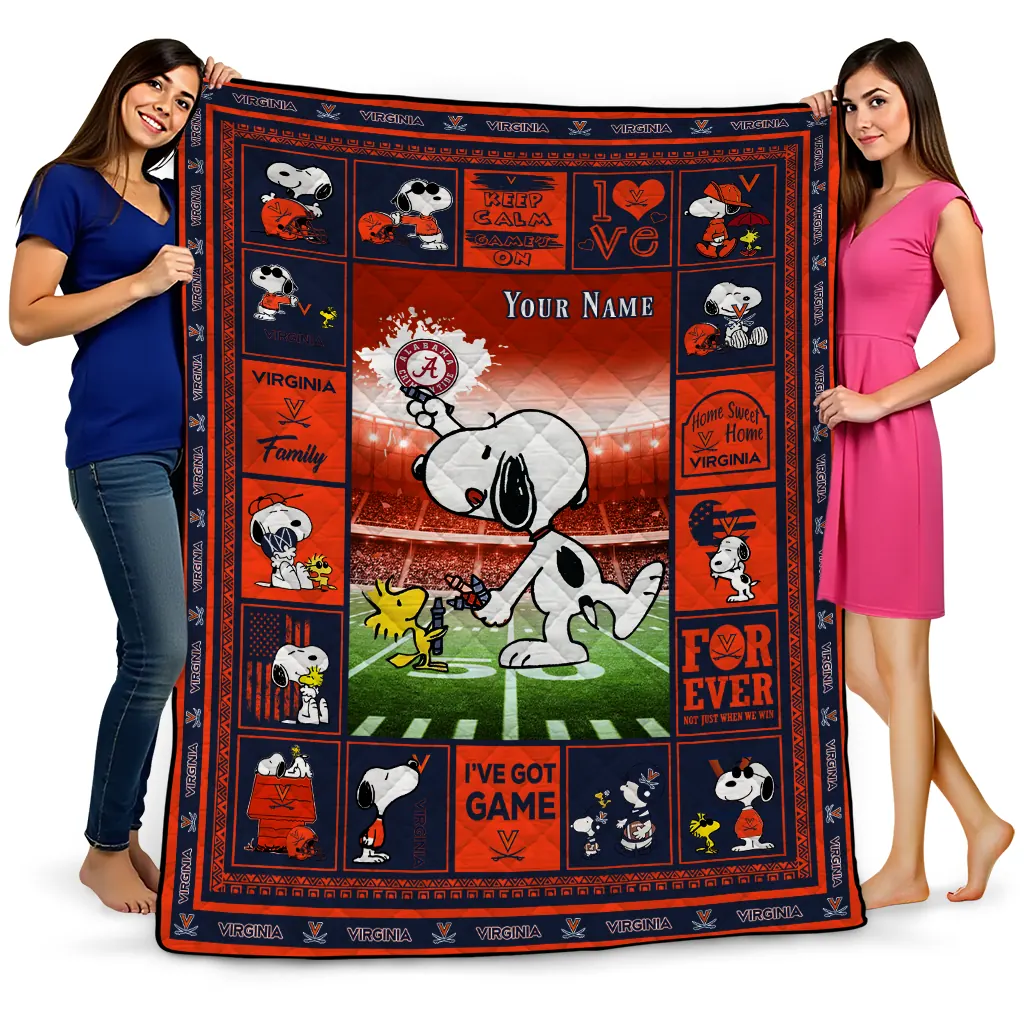 Wrap yourself in warmth and pride with the Customized Virginia Cavaliers Snoopy Coach Blue Quilt Blanket from the Virginia Cavaliers Blankets collection at Yes That Blanket. Made from 100% premium quilting-weight polyester blended with a touch of microfiber, this quilt offers a smooth, soft finish you’ll love. Choose between two quilting styles—Stipple or Diagonal—and enjoy the comfort of a cotton-filled layer inside that adds extra coziness for every season. The border is available in classic black or white, giving your design a clean, timeless edge.