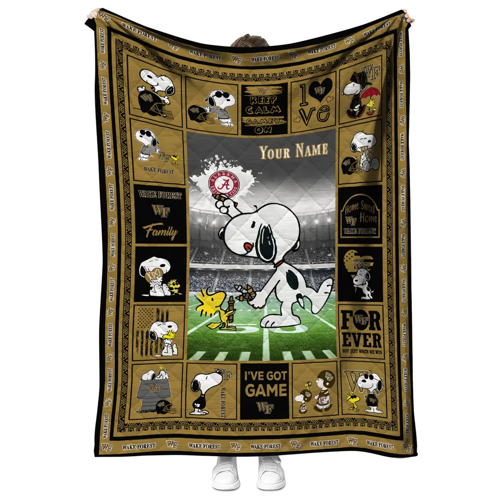 Wrap yourself in warmth and pride with the Customized Wake Forest Demon Deacons Snoopy Coach Gold Quilt Blanket from the Wake Forest Demon Deacons Blankets collection at Yes That Blanket. Made from 100% premium quilting-weight polyester blended with a touch of microfiber, this quilt offers a smooth, soft finish you’ll love. Choose between two quilting styles—Stipple or Diagonal—and enjoy the comfort of a cotton-filled layer inside that adds extra coziness for every season. The border is available in classic black or white, giving your design a clean, timeless edge.