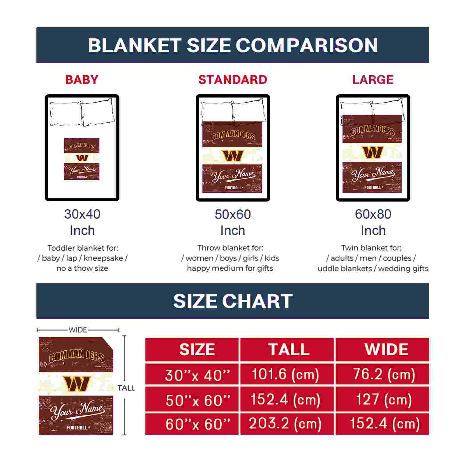 Without a doubt, the Customized Washington Commanders Grunge Texture Burgundy White Blanket from Washington Commanders Blankets collection is offering true fans a chance to showcase passion in a cool way. Personalize it with your favorite team’s logo or a meaningful name to make it uniquely yours. Isn’t that great? The full-color print ensures vibrant, edge-to-edge designs, bringing your sports enthusiasm to life!