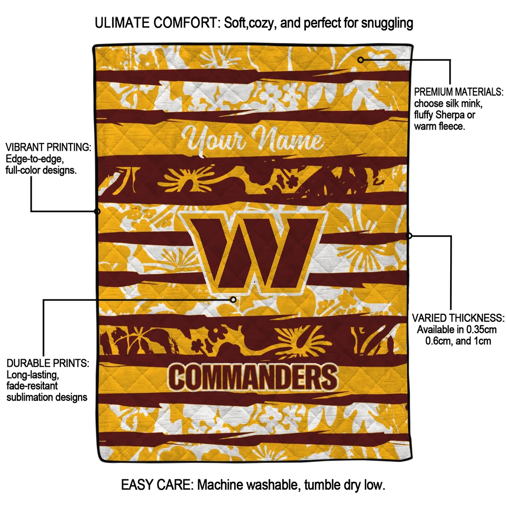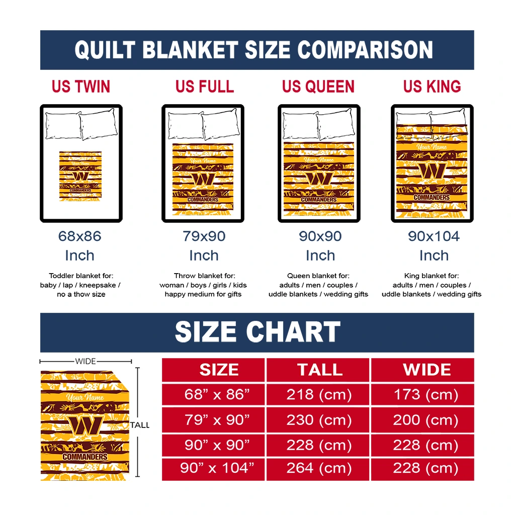 Wrap yourself in warmth and pride with the Customized Washington Commanders Layered Florals Burgundy White Quilt Blanket from the Washington Commanders Blankets collection at Yes That Blanket. Made from 100% premium quilting-weight polyester blended with a touch of microfiber, this quilt offers a smooth, soft finish you’ll love. Choose between two quilting styles—Stipple or Diagonal—and enjoy the comfort of a cotton-filled layer inside that adds extra coziness for every season. The border is available in classic black or white, giving your design a clean, timeless edge.