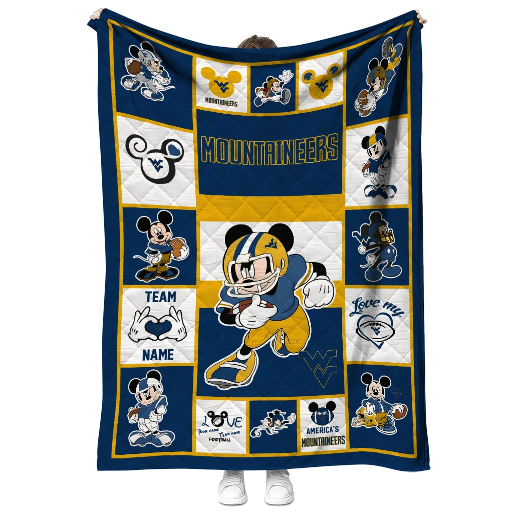 Wrap yourself in warmth and pride with the Customized West Virginia Mountaineers Mickey Crimson Blue White Quilt Blanket from the West Virginia Mountaineers Blankets collection at Yes That Blanket. Made from 100% premium quilting-weight polyester blended with a touch of microfiber, this quilt offers a smooth, soft finish you’ll love. Choose between two quilting styles—Stipple or Diagonal—and enjoy the comfort of a cotton-filled layer inside that adds extra coziness for every season. The border is available in classic black or white, giving your design a clean, timeless edge.
