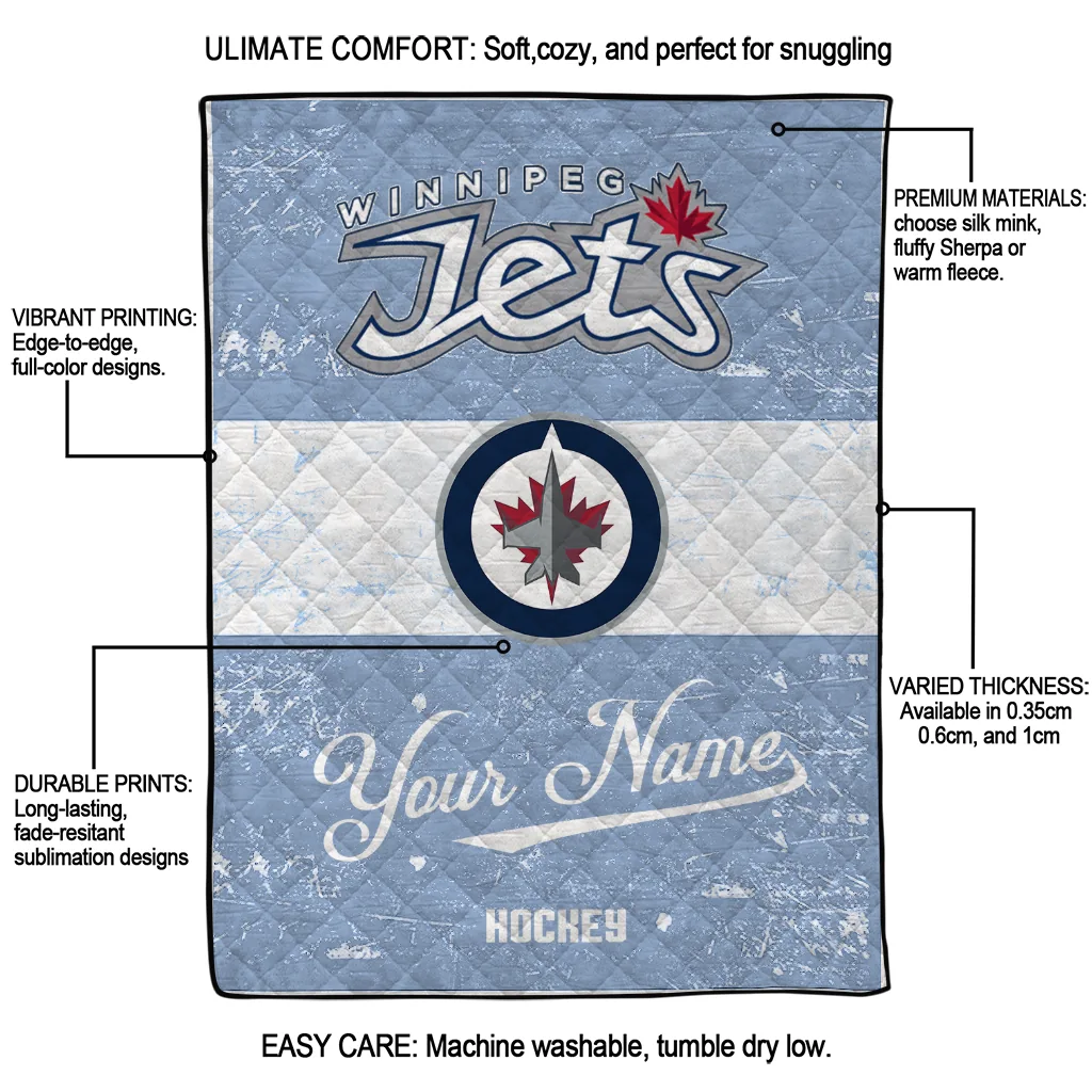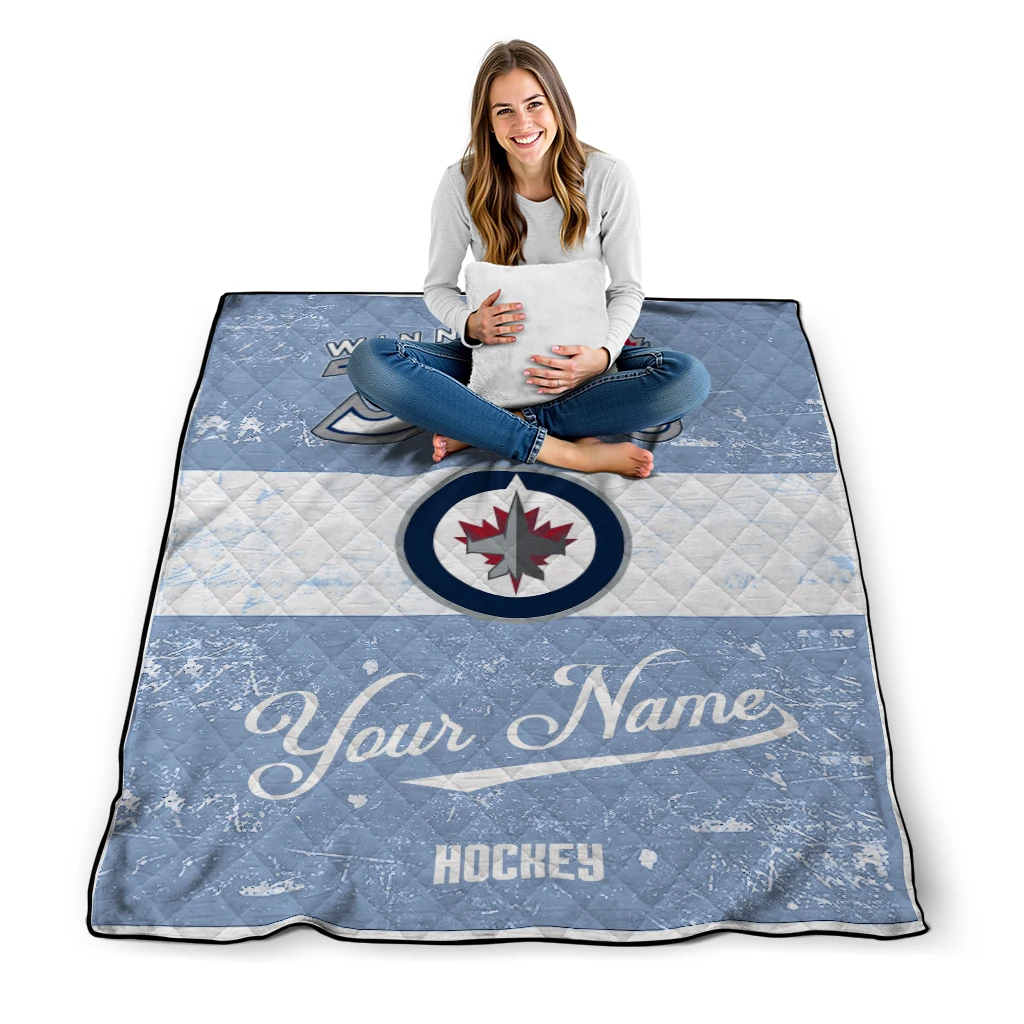 Wrap yourself in warmth and pride with the Customized Winnipeg Jets Pinstripe Lines Blue White Quilt Blanket from the Winnipeg Jets Blankets collection at Yes That Blanket. Made from 100% premium quilting-weight polyester blended with a touch of microfiber, this quilt offers a smooth, soft finish you’ll love. Choose between two quilting styles—Stipple or Diagonal—and enjoy the comfort of a cotton-filled layer inside that adds extra coziness for every season. The border is available in classic black or white, giving your design a clean, timeless edge.