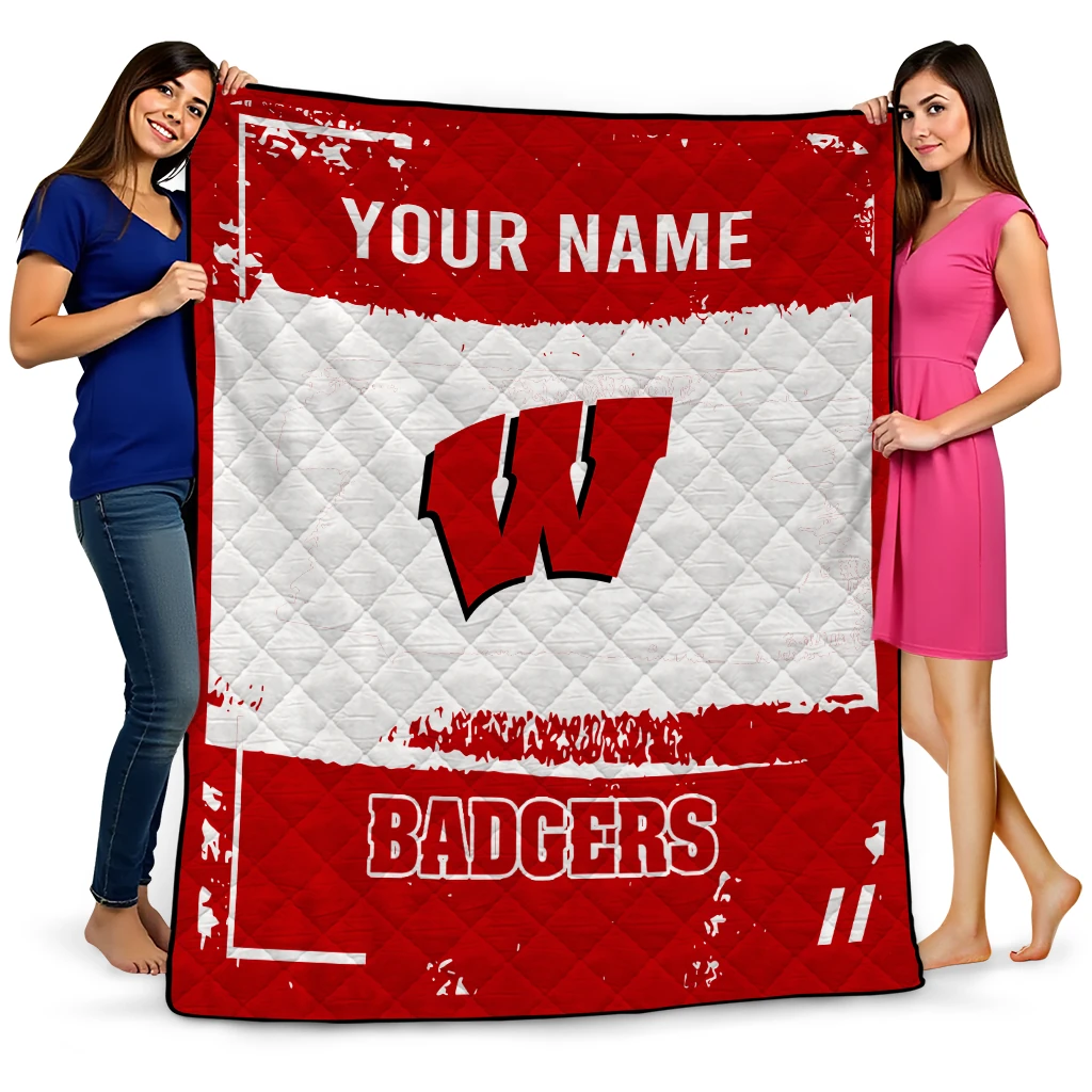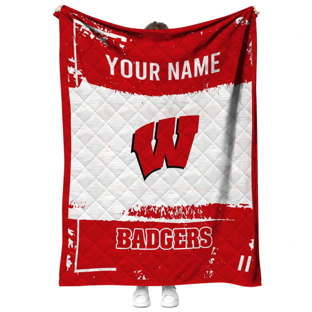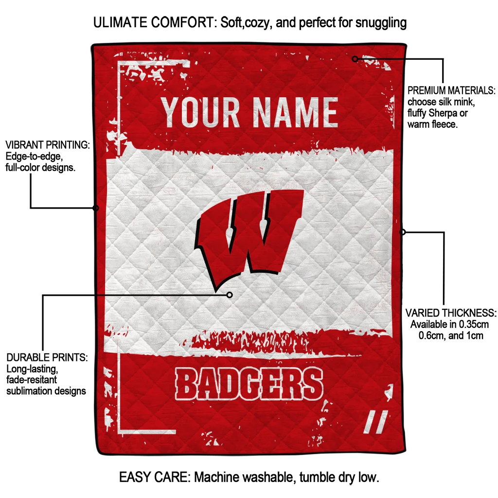 Customized Wisconsin Badgers Grunge Patch Red White Quilt Blanket