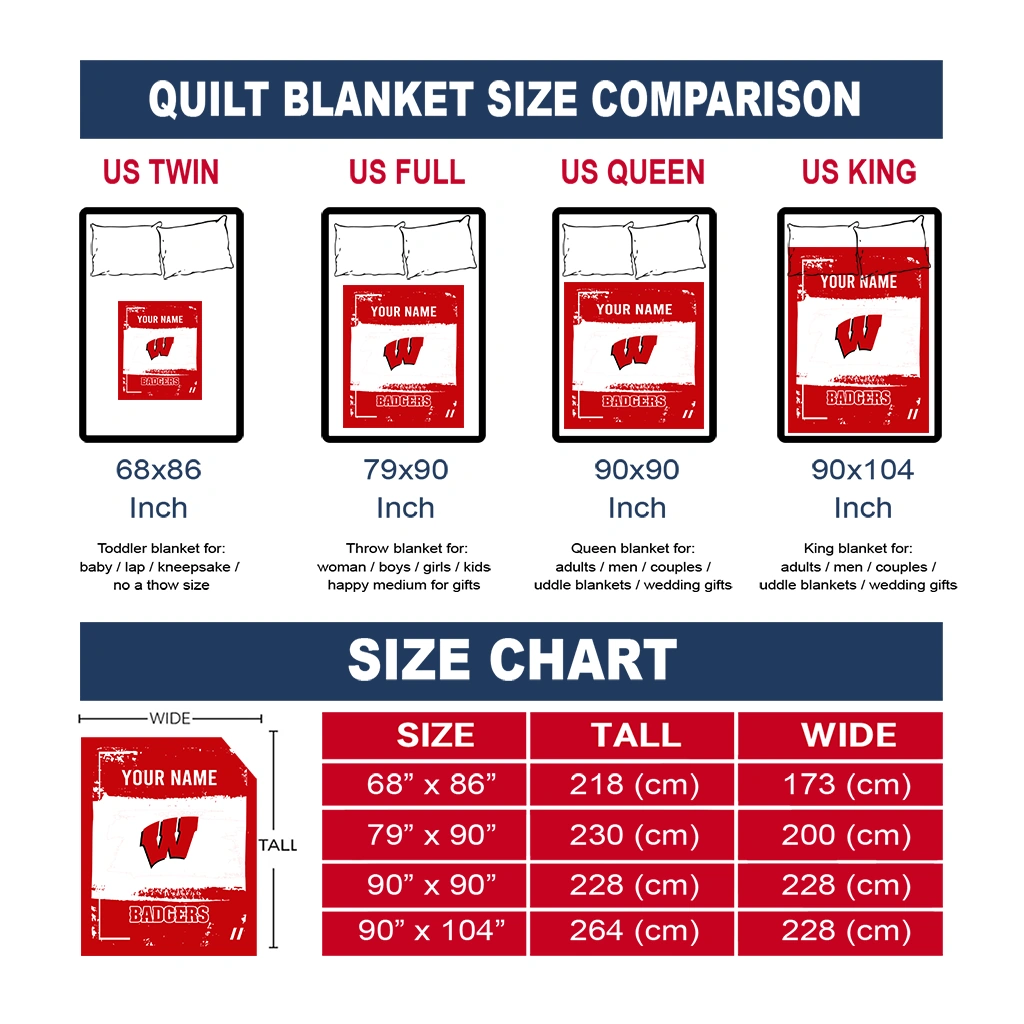 Wrap yourself in warmth and pride with the Customized Wisconsin Badgers Grunge Patch Red White Quilt Blanket from the Wisconsin Badgers Blankets collection at Yes That Blanket. Made from 100% premium quilting-weight polyester blended with a touch of microfiber, this quilt offers a smooth, soft finish you’ll love. Choose between two quilting styles—Stipple or Diagonal—and enjoy the comfort of a cotton-filled layer inside that adds extra coziness for every season. The border is available in classic black or white, giving your design a clean, timeless edge.
