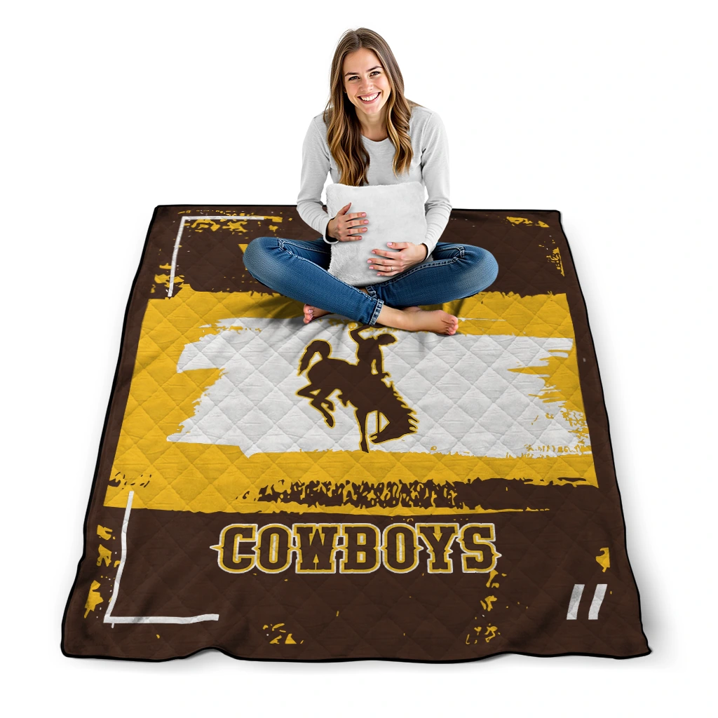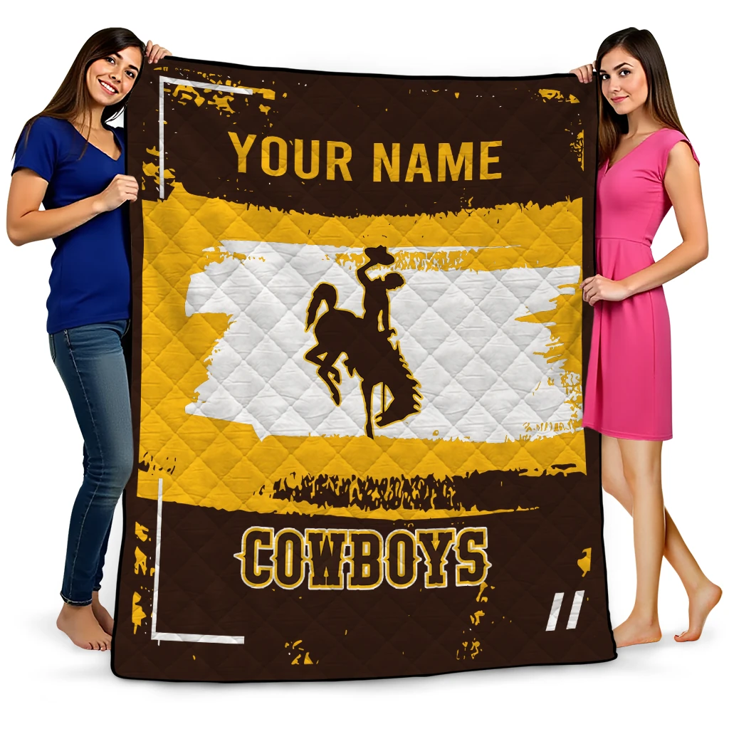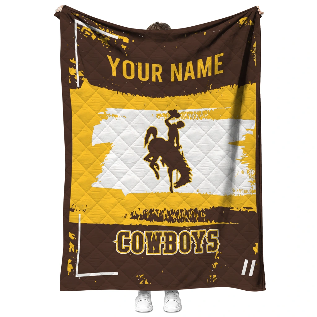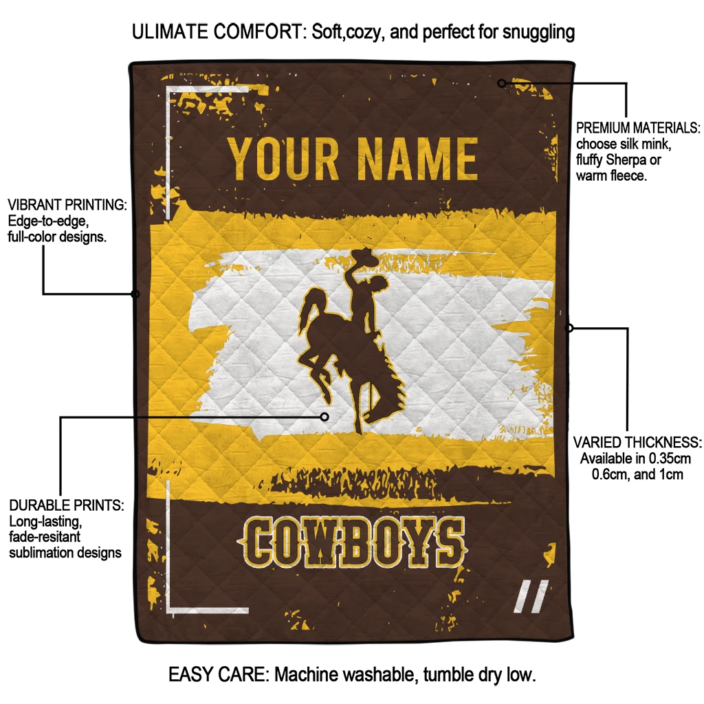 Wrap yourself in warmth and pride with the Customized Wyoming Cowboys Grunge Patch Brown White Quilt Blanket from the Wyoming Cowboys Blankets collection at Yes That Blanket. Made from 100% premium quilting-weight polyester blended with a touch of microfiber, this quilt offers a smooth, soft finish you’ll love. Choose between two quilting styles—Stipple or Diagonal—and enjoy the comfort of a cotton-filled layer inside that adds extra coziness for every season. The border is available in classic black or white, giving your design a clean, timeless edge.