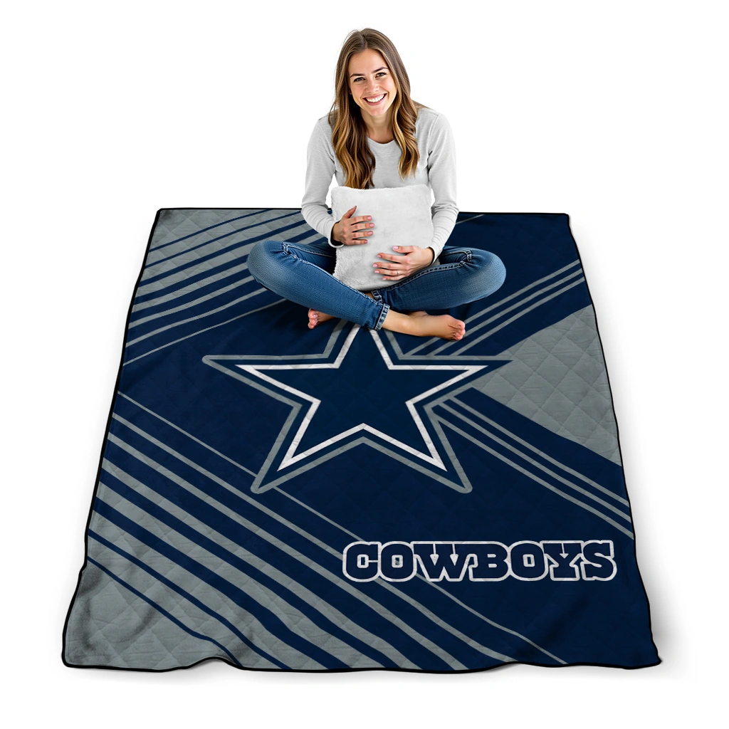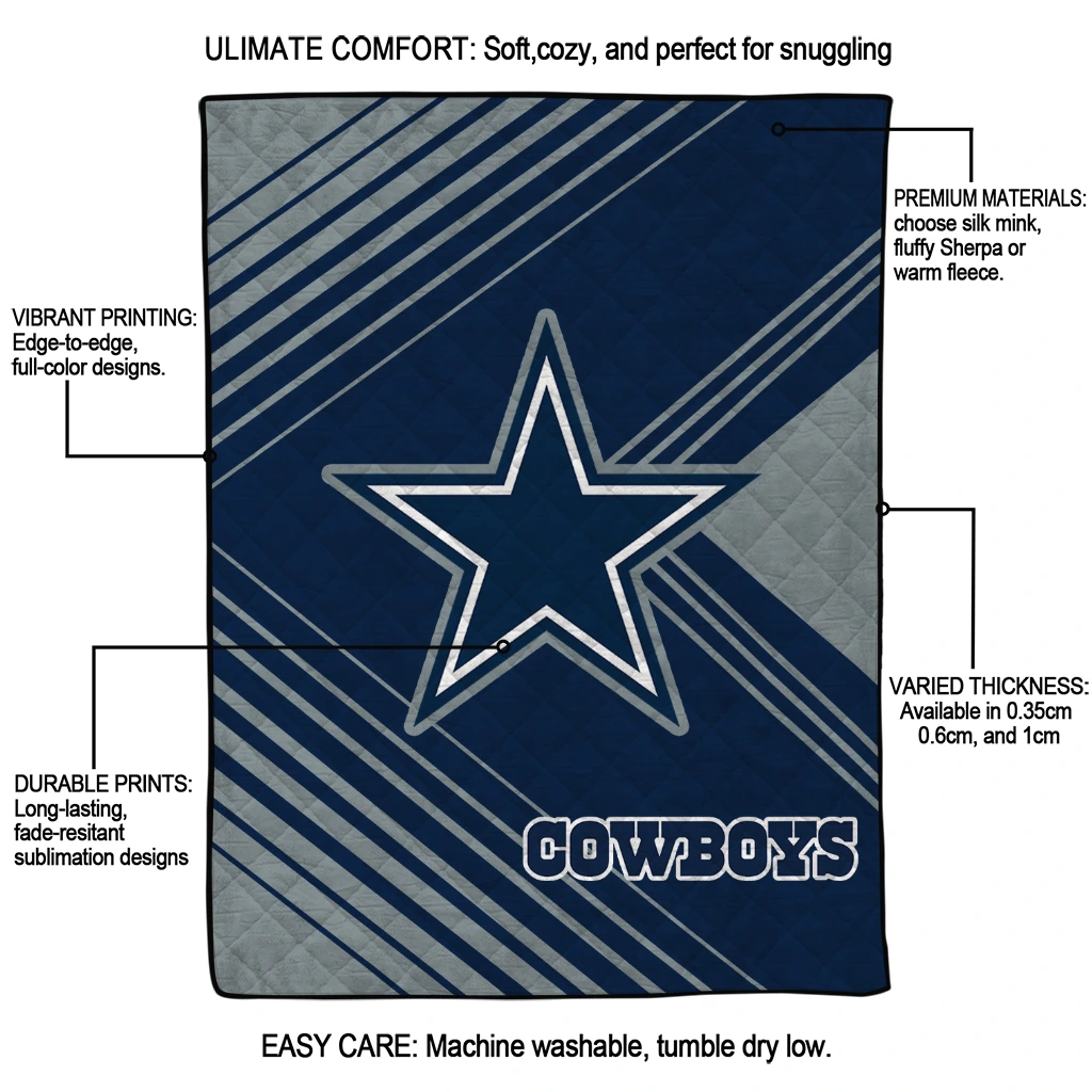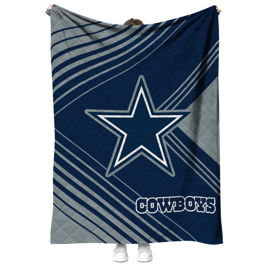 Wrap yourself in warmth and pride with the Dallas Cowboys Arrow Layers Blue Quilt Blanket from the Dallas Cowboys Blankets collection at Yes That Blanket. Made from 100% premium quilting-weight polyester blended with a touch of microfiber, this quilt offers a smooth, soft finish you’ll love. Choose between two quilting styles—Stipple or Diagonal—and enjoy the comfort of a cotton-filled layer inside that adds extra coziness for every season. The border is available in classic black or white, giving your design a clean, timeless edge.