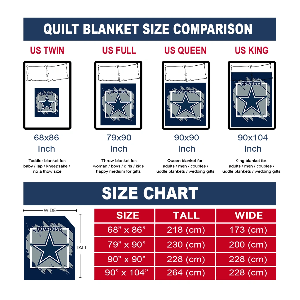 Wrap yourself in warmth and pride with the Dallas Cowboys Block Border Blue Quilt Blanket from the Dallas Cowboys Blankets collection at Yes That Blanket. Made from 100% premium quilting-weight polyester blended with a touch of microfiber, this quilt offers a smooth, soft finish you’ll love. Choose between two quilting styles—Stipple or Diagonal—and enjoy the comfort of a cotton-filled layer inside that adds extra coziness for every season. The border is available in classic black or white, giving your design a clean, timeless edge.