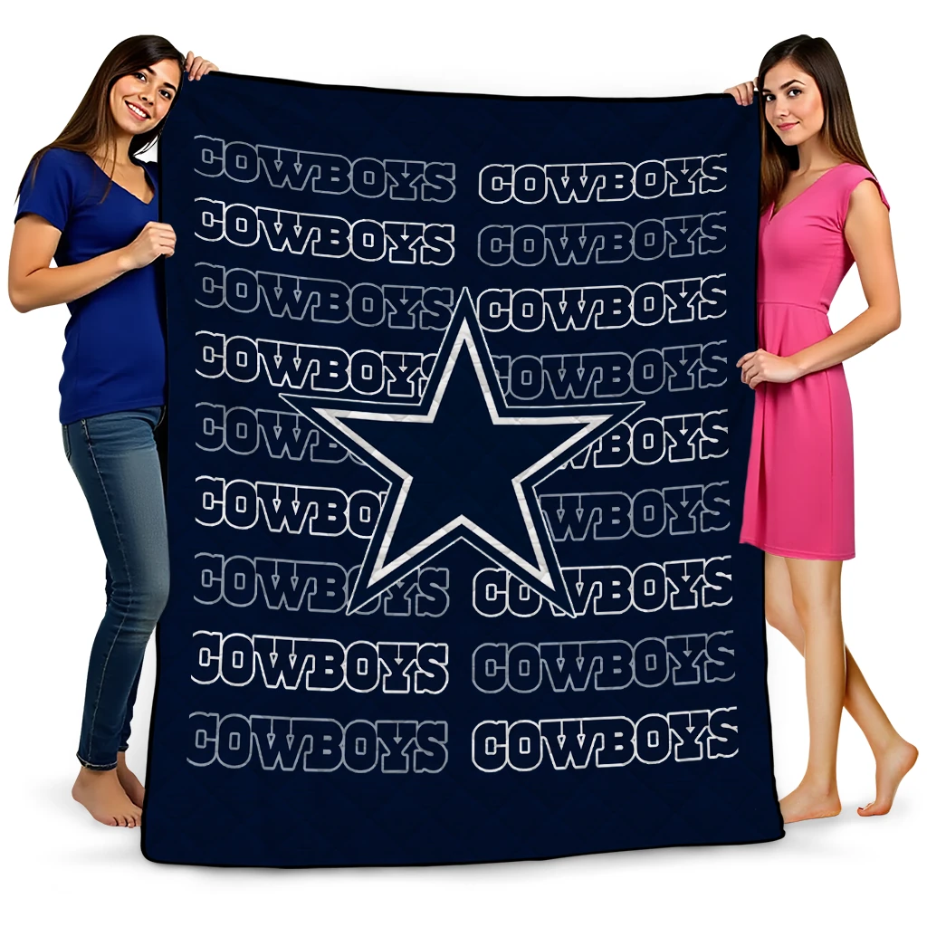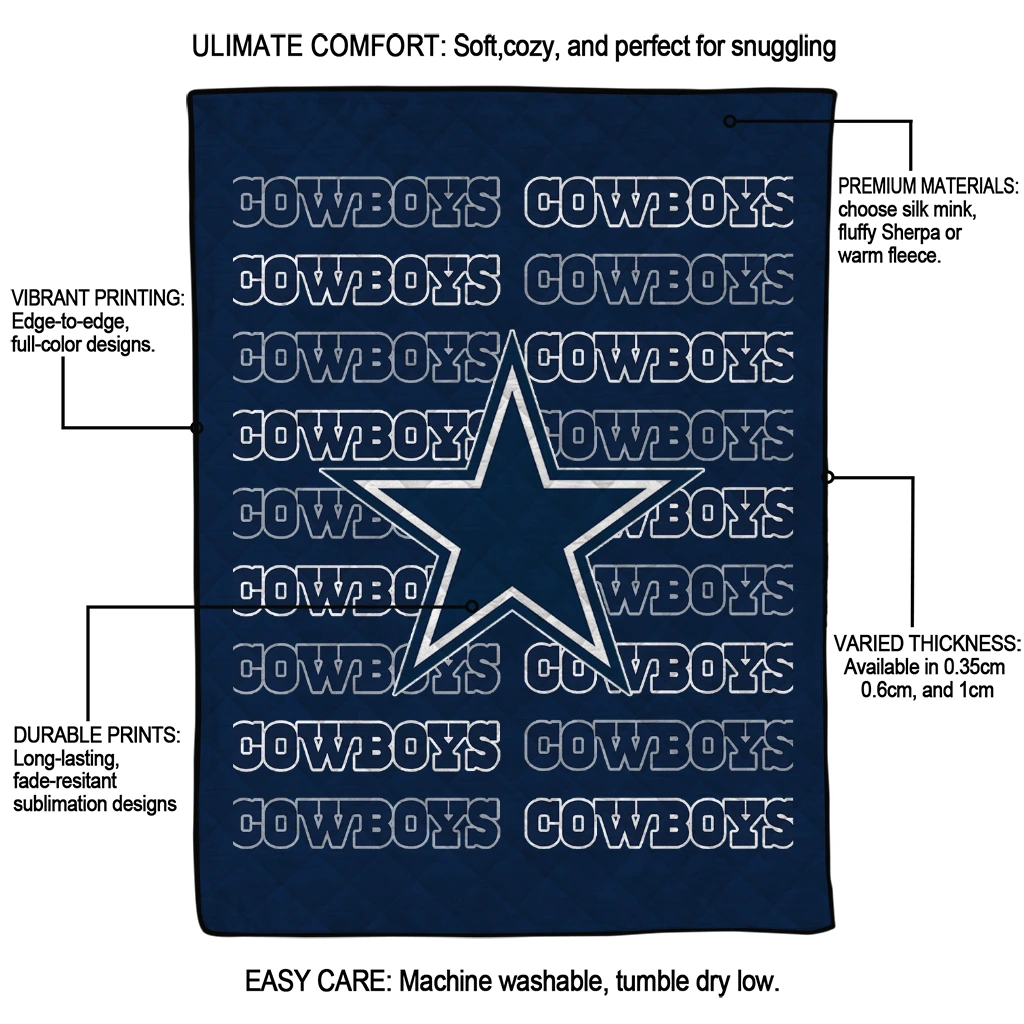 Wrap yourself in warmth and pride with the Dallas Cowboys Bold Red Blue Quilt Blanket from the Dallas Cowboys Blankets collection at Yes That Blanket. Made from 100% premium quilting-weight polyester blended with a touch of microfiber, this quilt offers a smooth, soft finish you’ll love. Choose between two quilting styles—Stipple or Diagonal—and enjoy the comfort of a cotton-filled layer inside that adds extra coziness for every season. The border is available in classic black or white, giving your design a clean, timeless edge.